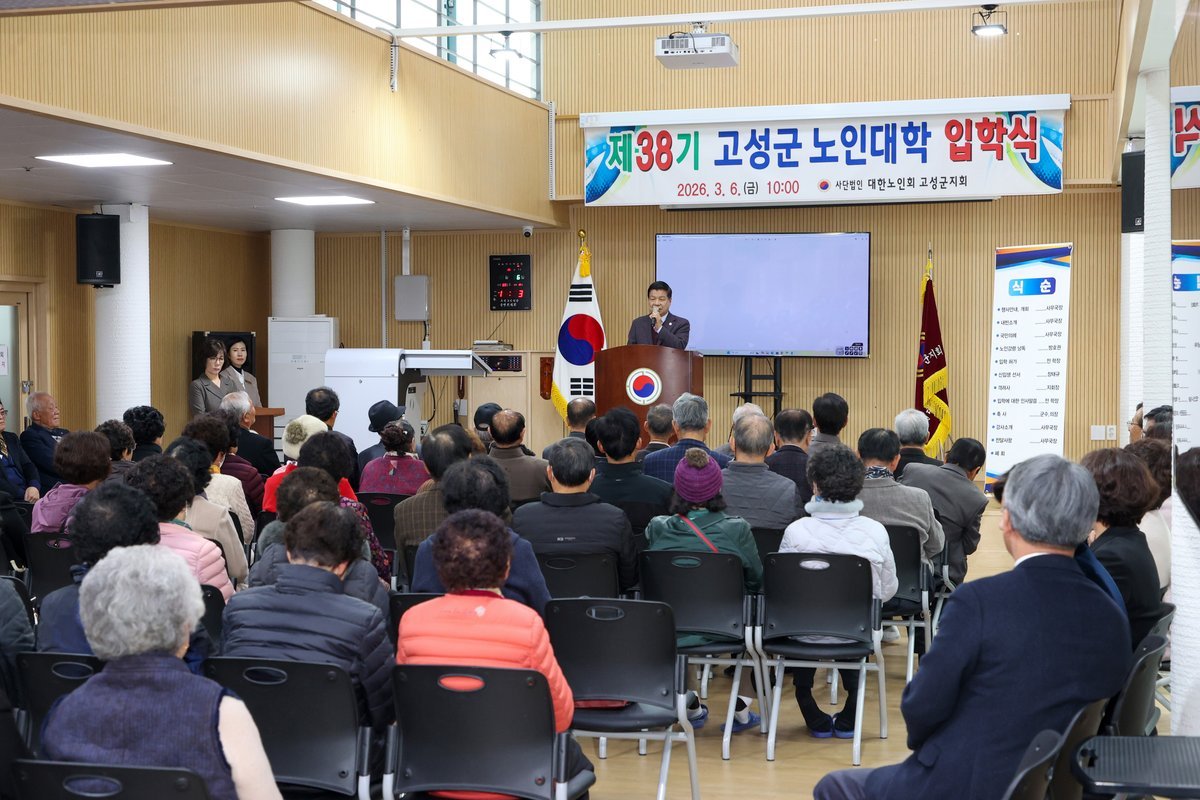 고성군은 대한노인회 고성군지회 부설 고성노인대학이 3월 6일 대한노인회 고성군지회 강당에서 2026년 제38기 고성노인대학 입학식을 개최했다고 밝혔다.이번 입학식에는 신입생 135명을 비롯해 대한노인회 관계자, 지역 어르신, 내빈 등 150여명이 참석해 어르신들의 새로운 배움의 출발을 함께 축하했다.노인대학은 지역 어르신들에게 평생학습의 기회를 제공하고 건강하고 활기찬 노후생활을 지원하기 위해 운영되며 교양강좌 건강관리 문화활동 여가프로그램 등 다양한 교육과정을 운영할 예정이다.군 관계자는 “배움에는 끝이 없으며 오늘 이 자리는 어르신들께서 새로운 도전을 시작하는 뜻깊은 자리”며 “노인대학에서의 다양한 배움과 활동이 어르신들의 삶에 활력과 즐거움을 더해주기를 바란다”고 말했다.한편 고성노인대학은 매년 지역 어르신들을 대상으로 다양한 평생교육 프로그램을 운영하며 어르신들의 사회참여 확대와 활기찬 노후생활 지원에 기여하고 있다. -
