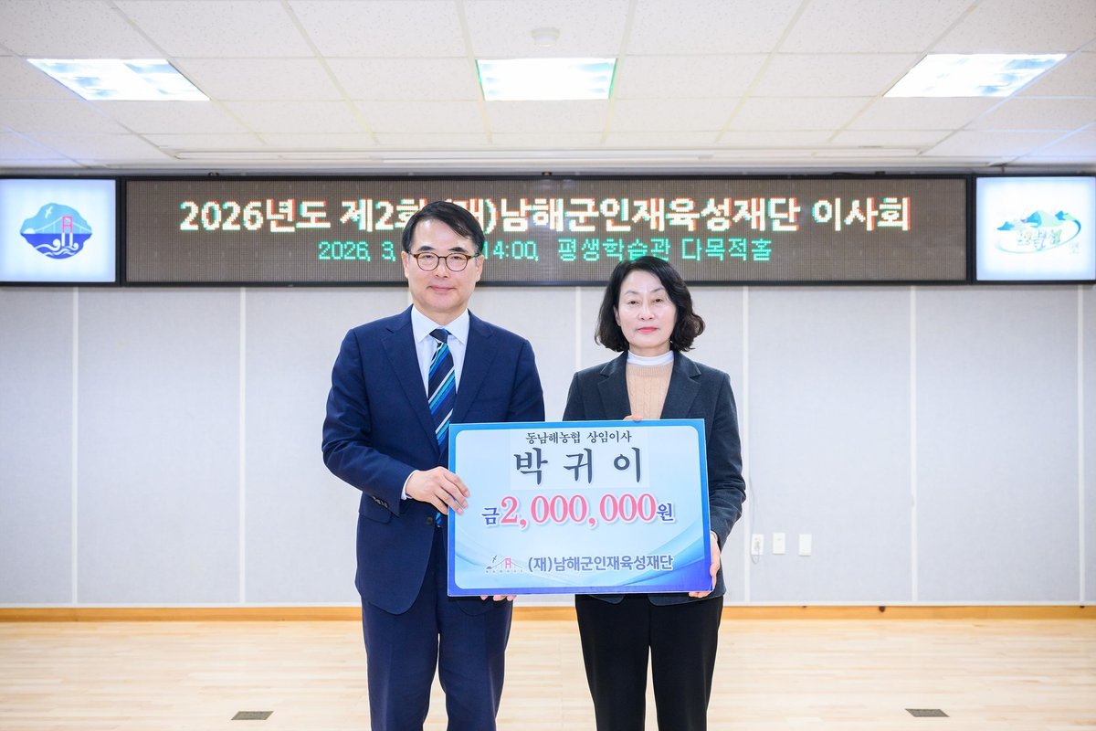 남해군인재육성재단은 동남해농협 박귀이 상임이사가 200만원, 불지암에서 100만원, 보물섬해녀언니 하은숙 대표가 100만원, 보광운수 김일남 대표가 150만원의 인재육성기금을 기탁했다고 밝혔다.지난 3월 5일 열린 남해군인재육성재단 이사회에서 박귀이 이사가 인재육성기금 200만원을 기탁했다.재단 이사이자 동남해농협 상임이사인 박귀이 이사는 “인재육성재단의 이사로서 지역 아이들을 위해 솔선수범하며 관심을 보이고 싶었다. 남해 지역 아이들이 더 많은 장학 혜택을 받을 수 있도록 앞으로도 지속적인 관심을 갖겠다”고 전했다.박귀이 이사는 2024년에도 200만원의 인재육성기금을 기탁한 바 있다.지난 2월 서면 중현리 소재 암자 불지암에서 인재육성기금 100만원을 계좌로 전달했다.많은 불자의 마음을 모아 부처님의 가르침에 따라 나눔을 실천하고자 한다고 전했다.불지암은 2013년 첫 기탁을 시작으로 매년 새해 초마다 계좌 기탁을 이어오고 있으며 현재까지 총 1450만원을 기탁하며 지역사회에 귀감이 되고 있다.또한 3월 3일 보광운수 김일남 대표가 인재육성기금 150만원을 기탁했다.보광운수는 마을 버스회사로 보리암을 찾는 방문객들이 안전하게 이동할 수 있도록 마을버스를 운영하고 있으며 수익의 일부를 사회에 환원하는 의미로 꾸준한 기부를 이어오고 있다.김일남 대표는 지금까지 총 960만원을 기탁 하며 지역사회와 함께 성장하는 따뜻한 나눔을 실천해오고 있다.같은 날 창선면 남해로컬푸드직매장 내 ‘보물섬해녀언니’를 운영하는 하은숙 대표도 지역인재육성을 위한 인재육성기금 100만원을 계좌로 전달했다.하은숙 대표는 “지역에서 받은 사랑을 지역 아이들에게 다시 돌려줄 수 있어 기쁘다. 작은 마음이지만 아이들의 꿈을 응원하는 데 보탬이 되길 바란다”고 전했다.‘보물섬해녀언니’는 지역에서 생산된 신선한 먹거리를 제공하며 지역사회와 함께 성장하는 공간으로 자리매김하고 있다.남해군인재육성재단 이사장은 “지역 인재 육성을 위해 소중한 정성을 보내주신 모든 기탁자분들게 깊이 감사드린다. 전달해 주신 기금은 우리 지역 학생들이 꿈을 키우고 미래를 준비하는 데 소중히 사용하겠다”고 밝혔다. -