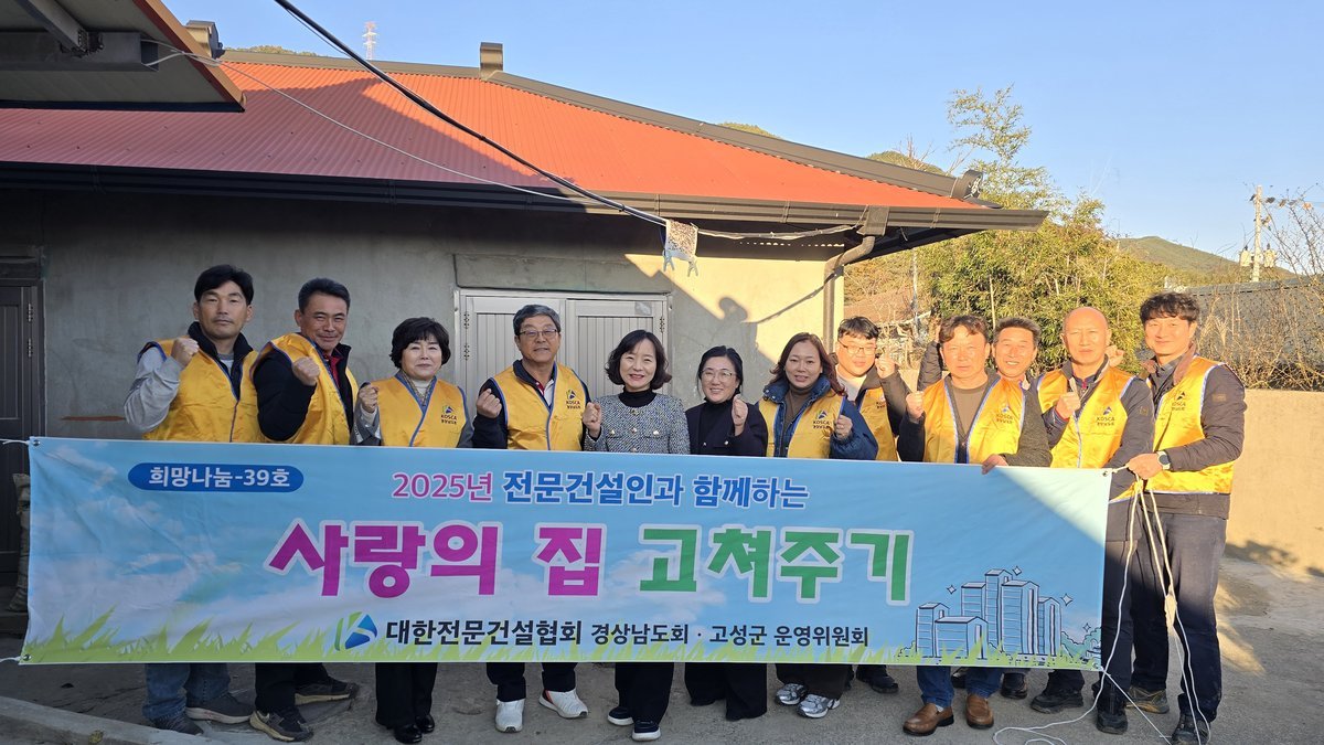 대한전문건설협회 고성군운영위원회가 '2025년 전문건설인과 함께하는 사랑의 집 고쳐주기' 사업을 통해 지역사회에 따뜻한 온정을 전했다.위원회는 지난 11월 28일, 고성군 내 돌봄이 필요한 취약계층...