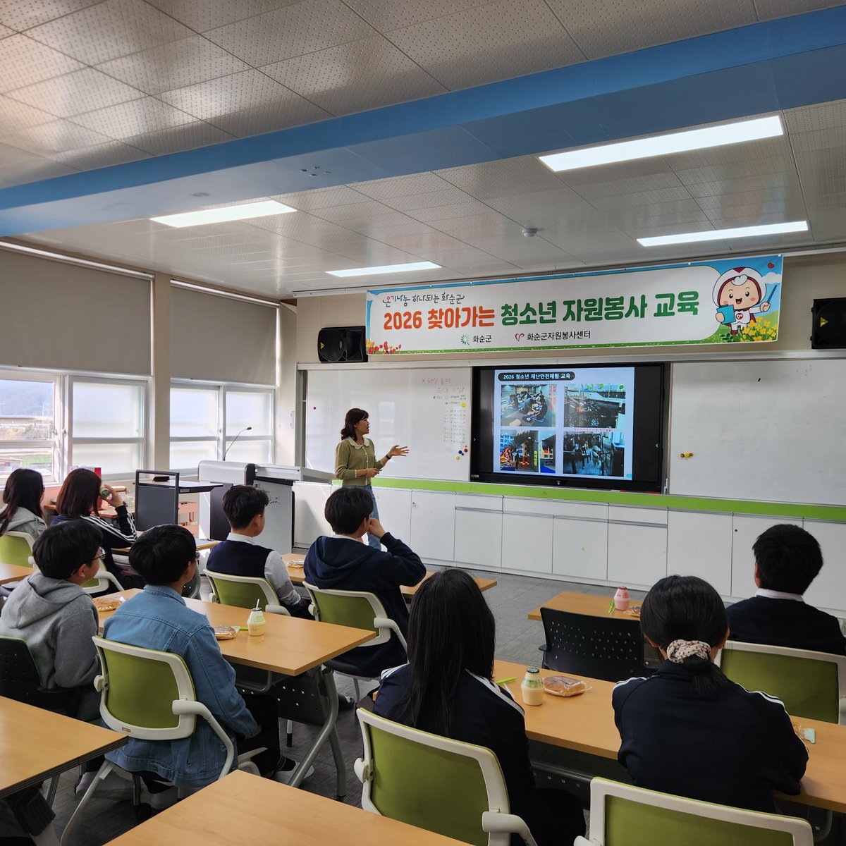 화순군이 미래 주역인 청소년들에게 나눔의 가치를 심어주기 위해 '2026 찾아가는 청소년 자원봉사 교육'을 실시했다.지난 27일, 화순군은 화순동복중학교에서 자원봉사센터 교육 코디네이터가 직접 학...