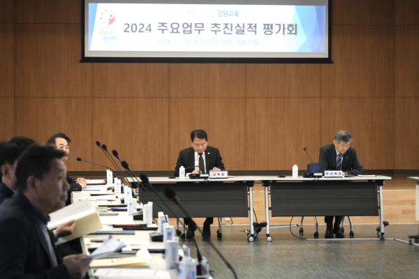 강원특별자치도교육청은 11월 18일 오후 3시 30분 도교육청 2층 대회의실에서 신경호 교육감, 부교육감, 국장, 과장, 팀장이 참석한 가운데 ‘2024 주요업무 추진실적 평가회’를 개최했다. 이번 평가회는 “학교를 변화로 채우다”를 주제로 2024년 주요업무 추진 성과를 공유하고 ‘마음껏 펼치는 강원교육’ 5대 정책 기본 방향 실현을 통해 더 나은 강원교육 발전 방향을 논의하기 위해 마련됐다. 평가회는 △도교육청 각 부서의 주요업무 추진 실적 보고 △학교현장 지원 방안, 기관 간 협력 사례, 위기 극복 사례 등 실질적인 지원 방안 논의 △질의응답 및 현안사항 협의 등의 순서로 진행됐으며 현장 중심 정책 실현을 위한 참석자 간 소통이 활발히 이루어졌다. 신경호 교육감은 “이번 평가회가 강원교육정책의 발전과 실질적인 변화를 위한 중요한 계기가 될 것”이라며 “교육 현장과의 긴밀한 협력을 통해 더 나은 강원교육을 만들어가겠다”고 말했다.