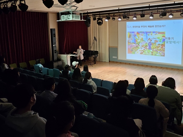 광주학생예술누리터가 10~11월 광주비엔날레와 연계한 특별한 토요예술공방을 운영한다. 토요예술공방은 지역에서 활동하고 있는 예술인과 함께 예술을 배우는 매달 진행되는 지역연계 문화 예술 프로그램으로 이번 특별 프로그램은 지난 26일과 오는 11월 30일 두 차례에 걸쳐 마련됐다. 토요공방에 참가하는 학생, 학부모는 총 70명으로 사진 진행한 사전 모집을 통해 선발했다. 지난 26일에는 윤은애 시민도슨트가 ‘현대 미술에서 보물찾기’를 주제로 현재 광주비엔날레 전시관에서 선보이고 있는 작품에 대한 설명과 현대 미술사에 대해 소개했다. 이어 11월 30일에는 광주비엔날레 전시 작품을 관람한 학생이 그 영감을 바탕으로 작품을 만드는 시간을 가진다. 학생들은 ‘작가탄생 비엔날레를 꿈꾸다’를 주제로 ‘패치워크’, ‘우드버닝’, ‘콜라주‘, ’ 자이언트얀 빅백‘ 등 활동을 할 예정이다. 토요예술공방에 참여한 한 학생의 보호자는 “주말마다 색다른 예술체험을 할 수 있어 주말이 기다려진다”며 “학부모도 함께 강연을 들을 수 있고 비엔날레 작품을 설명해줘 관람에 도움이 됐다”고 소감을 밝혔다. 이정선 교육감은 “학생들이 비엔날레 전시 작품에서 받은 영감을 마음껏 표현했으면 한다”며 “토요예술공방 등의 프로그램을 통해 학생들이 문화 예술적 재능을 꽃피울 수 있도록 적극 지원하겠다”고 밝혔다. -