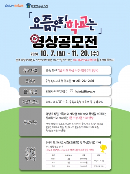 충청북도교육청은 오는 11월 20일까지 학생의 눈높이에서 바라본 우리학교 자랑을 주제로 ‘요즘 우리 학교는’ 영상 공모전을 진행하고 있다고 밝혔다. 학생이 직접 기획하고 제작해 창의적이고 재치 있는 2분 이내의 영상으로 △점심시간 스포츠 리그전 △독서동아리 활동 △학교 축제 △마을과 연계한 방과후학교 교육활동 등 학교에서 이루어지는 특색 있는 모든 교육활동을 담으면 된다. 응모 희망자는 11월 20일까지 도교육청 누리집에서 신청서 개인정보 및 초상권 수집·이용 동의서를 다운로드 받아 영상파일과 함께 이메일로 제출하면 된다. 향후, 도교육청은 12월 5일까지 두 번의 심사를 거쳐 최우수 3팀, 우수 3팀, 장려 10팀 등 총 16팀을 선정하고 교육감상과 상금을 수여할 계획이며 수상작은 도교육청 유튜브 등 공식 SNS에 게재될 예정이다. 출품규격이나 유의사항 등 자세한 사항은 누리집과 공보관 교육홍보팀으로 문의하면 된다. 우관문 공보관은 “학교 현장에서 펼쳐지는 교육활동을 학교만의 특별한 영상을 제작해 생동감 있는 영상으로 지속 가능한 공감·동행 교육을 실현하는 계기가 되기를 바란다”며 “우리 학생들이 직접 제작한 참신한 콘텐츠 발굴로 교육정책 홍보에도 큰 도움이 될 것으로 기대한다”고 말했다. -