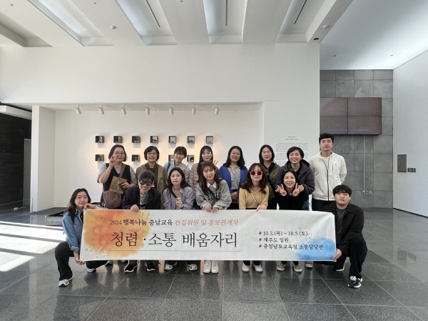충남교육청은 10월 3일부터 5일까지 2박 3일간 제주도에서 충남교육소식지 편집위원 및 업무 관계자 20명을 대상으로 하는 ‘2024 행복나눔 충남교육 편집위원 배움자리’를 실시한다. 이번 배움자리는 충남교육소식지 편집위원 및 홍보관계자들의 역량강화를 위한 다양한 예술품 투어 및 전시관람 등을 진행해 새로운 홍보 방식을 착안·수집하고 소식지의 편집 방향을 점검해 향후 개편 계획에 반영하고자 마련됐다. 충남교육 현장의 생생한 소식을 담아 매월 47,000부를 발행하는 충남교육 소식지는 전국 관계 기관과 구독자에게 무료 배포하고 있으며 소식지 편집위원은 교사 및 일반직 공무원 등 충남교육청 교직원들로 구성되어 있다. 이진석 소통담당관은 “편집위원과 업무관계자들이 함께 소통하고 공감하는 배움자리를 통해 충남교육소식지의 역할을 높이고 충남교육 홍보에 더욱 이바지할 수 있도록 최선을 다하겠다”고 말했다. 충남교육청은 충남교육소식지 이외에도 ‘고 팀장 시리즈’, [기념일 특집’ 등 다양한 교육정책 홍보영상을 제작하고 유튜브와 다양한 사회관계망서비스를 통해 정책을 친근하게 전달해 교육공동체의 큰 호응을 얻고 있다. -