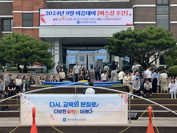 광주시교육청이 점심시간을 활용해 직원과 시민들에게 힐링과 소통의 무대를 선사한다. 시교육청은 23일 본청 야외 소통무대인 이음광장에서 ‘이음데이’을 운영했다. ‘이음데이’는 지난해 시교육청이 본청에 조성한 야외 소통무대인 이음광장에서 다양한 문화·예술 프로그램을 운영하는 행사로 지난 4월에는 야외음악회를 선보였다. 이번 이음데이는 버스킹 형식으로 더욱 자유롭고 편안한 분위기로 진행됐다. 특히 점심시간 30분동안 가수를 꿈꾸는 실용음악학원 가수 지망생들이 국내가요를 부르는 무대를 가졌다. 이음데이는 오는 25일과 27일 점심시간에도 열린다. 25일에는 음악을 사랑하는 사람들이 모여 가야금, 통기타, 드럼 등 다양한 음악적 경험을 들려주고 마지막 날인 27엘에는 교직원, 시민 등으로 구성된 다나밴드가 추억의 가요와 탭댄스 등을 선보일 예정이다. 버스킹에 참여한 한 가수지망생은 “공공기관에서 이런 행사를 마련한다는 것이 매우 신선하게 다가왔다” “가까운 거리에서 관객들과 눈을 마주치며 소통할 수 있어 무척 특별한 경험이었다”며 “시교육청에서 힐링의 기회를 자주 마련해줬으면 좋겠다”고 소감을 밝혔다. 이정선 교육감은 “가을의 문턱에서 이음데이를 통해 직원들과 시민들이 바쁜 일상 속에서 잠시나마 여유를 느끼고 마음의 휴식을 취했으면 한다”며 “직원들과 시민들이 함께하는 다양한 문화 프로그램을 지속적으로 마련해 운영하겠다”고 말했다. 한편 지난해 본청에 조성된 이음광장은 학생, 학부모, 교직원, 시민 누구나 사전신청을 통해 자유롭게 사용할 수 있는 열린공간이다. -