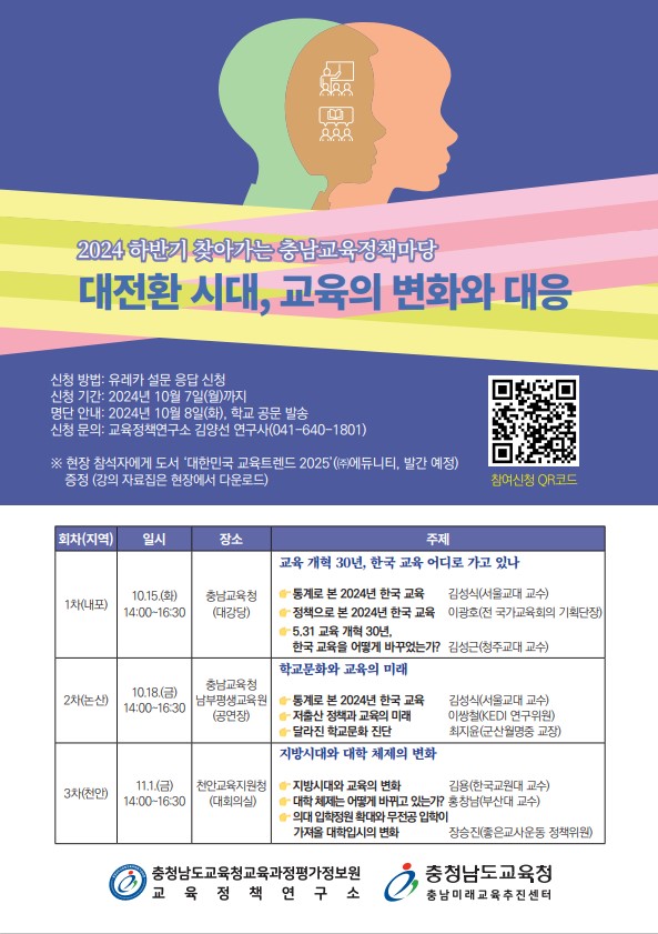 충남교육청 충남미래교육추진센터와 교육과정평가정보원 교육정책연구소가 10월과 11월 두 달 동안 내포, 논산, 천안 세 곳에서 “대전환 시대, 교육의 변화와 대응”이란 대주제로 하반기 찾아가는 충남교육정책마당을 개최한다. 충남미래교육추진센터와 교육정책연구소는 올 상반기에 ‘서울대 10개 만들기’ , ‘평가를 바꾸자’ 등을 주제로 교육의 근본적 변화에 대한 교육공동체의 공론을 주도했다. 이번에는 교육 개혁 30년을 돌아보는 시점에서 국가 차원의 주요 정책과 학교 현장의 여러 변화를 객관적 수치와 자료를 중심으로 이해하고 성찰하는 가운데 교육의 변화에 대응하며 충남교육이 나아갈 방향을 함께 모색할 방침이다. 특히 이번 하반기에는 현장 교원들의 참여도를 높이기 위해 교원들이 참석하기 편한 지역을 찾아가며 교육정책마당을 펼치고 횟수도 대폭 늘렸다. 상반기에 찾아가는 교육정책마당에 호응과 참여도가 높았던 점을 고려했다. 10월 15일 내포 충남교육청 대강당에서 열리는 1차 충남교육정책마당에서는 ‘교육개혁 30년, 한국 교육 어디로 가고 있나’를 주제로 김성식 서울교대 교수가 ‘통계로 본 2024년 한국 교육’, 이광호 전 국가교육회의 기획단장이 ‘정책으로 본 2024년 한국 교육’, 김성근 청주교대 교수가 ‘5.31 교육 개혁 30년, 한국 교육을 어떻게 바꾸었는가?’ 주제 강연하고 참석자와 토론을 벌인다. 10월 18일 논산 남부평생교육원 공연장에서 열리는 2차 충남교육정책마당에서는 김성식 서울교대 교수의 주제 강연과 더불어 이쌍철 한국교육개발원 연구위원이 ‘저출산 정책과 교육의 미래’, 최지윤 군산월명중 교장이 달라진 학교문화를 주제로 강연과 토론을 펼친다. 11월 1일 천안교육지원청 대회의실에서 열리는 3차 충남교육정책마당에서는 김용 한국교원대 교수가 ‘지방시대와 교육의 변화’, 홍창남 부산대 교수가 ‘대학체제는 어떻게 바뀌고 있는가?’, 장승진 좋은교사운동 정책위원이 ‘의대 입학정원 확대와 무전공 입학이 가져올 대학입시의 변화’ 주제 강연을 진행한 후 참석자들과 소통한다. 이영주 교육정책연구소장은 “바로 지금이 다가오는 2025년 이후의 교육변화를 예측하고 정책적 대응을 고민해야 하는 때임”을 강조하는 한편 “연구원들의 책상 위에서만 이루어지는 교육정책 연구가 아니라 현장과 소통하며 공론의 장을 열어가는 실효성 있는 연구와 현장성 있는 실천을 위해 ‘찾아가는 정책마당’ 형식으로 하반기 마당을 확장했다”고 덧붙이며 충남교육공동체의 높은 관심과 참여를 부탁했다. 문미란 충남미래교육추진센터장은 “충남미래교육추진센터와 정책연구소는 혁신미래교육의 방향과 실천 방안에 대해 논의한 결과 충남교육정책마당을 준비했다 교육 정책 변화에 대한 이해를 높이는 계기가 되길 바란다”고 말했다. 한편 이번 충남교육정책마당에 충남교육공동체 누구나 참가 신청할 수 있으며 신청마감은 10월 7일까지다. -