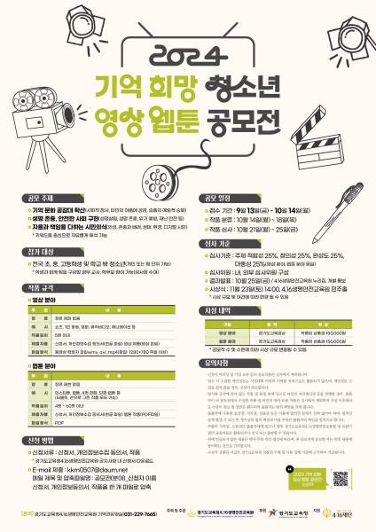 경기도교육청4.16생명안전교육원이 청소년을 대상으로 사회적 참사 기억과 공감, 자율과 책임 있는 시민 의식을 함양하고자 ‘2024 기억 희망 청소년 영상·웹툰 공모전’을 개최한다. 공모 분야는 영상과 웹툰 2개 분야로 전국 초·중·고등학생 및 학교 밖 청소년을 대상으로 진행한다. 공모 주제는 △기억 문화 공감대 확산 △생명 존중, 안전한 사회 구현 △자율과 책임을 다하는 시민 의식 등이다. 공모전 접수는 오는 13일부터 10월 14일까지이며 신청서와 함께 작품, 개인정보동의서를 담당자 전자우편으로 제출하면 된다. 이후 공정한 내·외부 심사를 거쳐 오는 10월 25일 4.16생명안전교육원 누리집에 총 20개의 수상작을 발표할 예정이다. 입상 청소년에게는 경기도교육감 표창과 함께 소정의 상품을 지급할 예정이다. 전명선 경기도교육청4.16생명안전교육원장은 “사회적 참사와 시민 의식을 주제로 삼은 공모전이기에 청소년에게 친숙한 영상 분야와 웹툰 분야를 공모 분야로 선정했다”며 “생명 존중과 안전한 사회를 위한 인식 전환의 계기가 될 수 있도록 많은 청소년이 참여해 주기를 바란다”고 말했다. -
