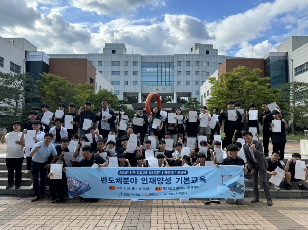 충남교육청은 지난 26일~29일 4일간 ‘직업교육 혁신지구 사업’에 참여하는 직업계고등학교 1학년 학생을 대상으로 반도체분야 인재양성 기본교육을 한국기술교육대학교에서 진행했다. ‘직업교육 혁신지구 사업’은 충청남도교육청과 지자체가 협력해 직업계고와 지역기업, 지역대학 간 연계를 통해 고졸 인재 성장과 지역 정착을 지원하는 직업교육으로 1학년 기본교육, 2학년 심화교육, 3학년 현장 실무 교육의 단계로 진행된다. 천안지구 60명의 학생들이 참여한 이번 교육은 지역 여건을 반영한 기업 수요 맞춤형 교육 방식으로 직업계고 학생들의 취업 역량을 높이고 일자리와 연계하기 위해 마련됐다. 교육 과정은 반도체 직무에 대한 이해도 향상을 위해 반도체 개론 이론과 회로판 제조공정 실습 등으로 구성됐다. 도교육청 미래인재과 오동규 과장은 “우리 교육청은 4차 산업혁명 시대 도래와 함께 변화하는 산업 구조에 대응해 반도체, 미래에너지 등 미래 첨단기술 선도할 인재 양성에 적극 지원하겠다”고 말했다. -