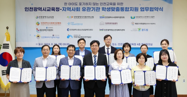 인천광역시교육청은 학생 중심의 맞춤형 통합지원을 위해 인천사회서비스원, 사회복지협의회, 사회복지사협회, 사회복지관협회 등 13개 지역사회 사회복지 및 아동·청소년 전문기관과 ‘학생맞춤통합지원 업무협약’을 29일 체결했다.