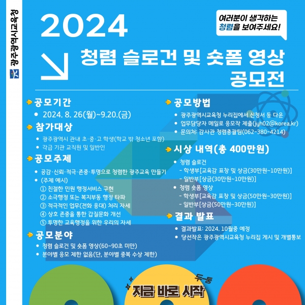 광주시교육청은 청렴한 광주교육에 대한 인식을 제고하고 청렴 문화를 확산시키기 위해 ‘2024 광주교육 청렴 콘텐츠 공모전’을 개최한다. 이번 공모전은 시교육청이 올해 추진하고 있는 ‘2024 청렴도 향상 종합정책’의 하나로 마련됐다. 공모 분야는 청렴 슬로건, 청렴 숏폼 영상 등 2개다. 참여 대상은 광주지역 학생, 교직원, 일반인 등으로 ‘공감·신뢰·적극·존중·투명으로 청렴한 광주교육 만들기’라는 주제로 이를 실현하기 위한 자세, 의지, 실천 등을 간결하고 창의적으로 표현하면 된다. 참여 희망자는 오는 26일부터 9월 20일까지 작품을 제작해 시교육청 업무 담당자 메일로 신청서와 함께 제출하면 된다. 시교육청은 심사를 거쳐 분야별 최우수, 우수, 장려 등 총 18편을 선정해 교육감 표창 등을 시상할 예정이다. 이정선 교육감은 “교육 가족과 광주 시민들이 만든 청렴 콘텐츠는 대내외 청렴 교육과 홍보에 활용할 예정이다”며 “참신한 아이디어를 가진 학생, 시민들의 많은 관심과 참여를 바란다”고 말했다. -