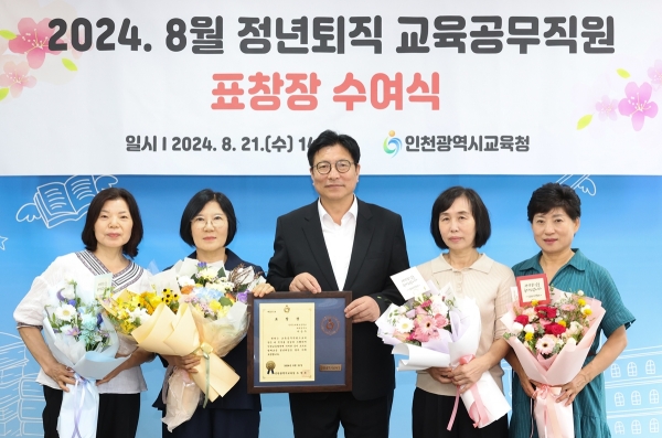 인천광역시교육청은 2024년 9월 1일 자로 정년퇴직하는 교육공무직원 10명에게 교육감 표창을 21일 수여했다. 2024년 9월 1일 자 정년퇴직 교육공무직원은 총 114명이며 표창 수여자는 공립학교에서 20년 이상 근무하며 인천교육 발전에 기여한 조리실무사, 과학실무사 등이다. 수여식은 학교 현장에서 학생들을 위해 헌신한 교육공무직원에게 감사의 마음을 전달하고 퇴직 후의 삶을 격려하기 위해 마련했다. 도성훈 교육감은 “퇴직 후에도 인천교육에 대한 지속적인 관심과 격려를 주신다면 앞으로도 인천교육 발전에 큰 힘이 될 것”이라며 “퇴임 후에도 건강한 제2의 인생을 보내시길 기원한다”고 말했다. 인천시교육청 관계자는 “앞으로도 교육공무직원과 협력적인 노사관계를 만들어 가기 위해 노력하겠다”고 말했다. -