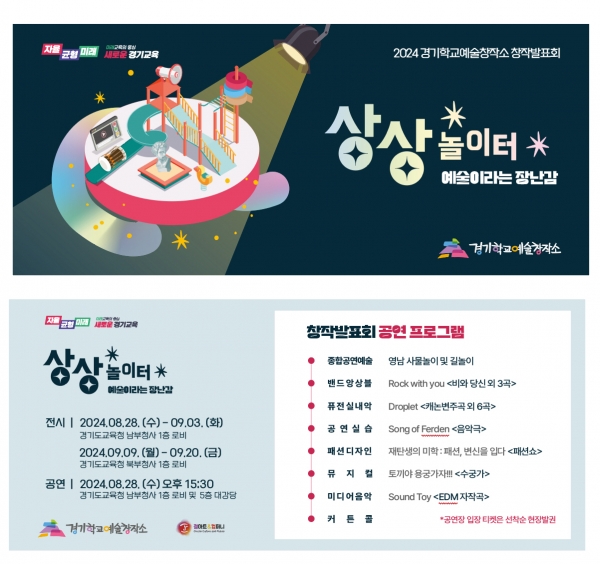 경기도교육청 경기학교예술창작소가 오는 28일 남부청사에서 전문예술교육과정 학생 창작발표회를 개최한다. 이번 발표회는 학생들의 예술 잠재성 확인과 성장의 자리로 ‘상상 놀이터’를 주제로 이뤄진다. 학생들은 예술적 감성으로 장르를 넘나들며 미래 전문예술인으로서 상상의 놀이터에서 재능을 마음껏 발휘하며 자신들의 이야기를 펼친다. 창작발표회는 경기도형 예술영재교육 ‘마스터 클래스’에 참여한 189명 학생의 창작작품 전시와 공연이 진행된다. 공연예술기획 프로그램에 참여한 학생들이 16개 교육프로그램을 주도적으로 융합하고 이번 발표회를 기획했다. 창작작품 전시는 △평면조형 △입체조형 △미디어아트 △웹툰 등 250여 점이 9월 3일까지 남부청사 1층 로비에서 전시된다. 북부청사 1층 소풍마루에서도 9월 9일부터 9월 20일까지 전시가 진행된다. 공연은 남부청사 1층 로비에서 ‘영남 사물놀이 및 길놀이’를 시작으로 5층 대강당에서 △창작뮤지컬 △밴드 앙상블 △퓨전 실내악 △미디어 음악 △창작뮤지컬을 하나로 융합해 진행된다. 채널 GO3에서 실시간 생중계된다. 도교육청 조영민 융합교육정책과장은 “학교 밖 예술교육의 우수사례를 공유하고 경기공교육시스템 학교 밖 학점 인정의 필요성을 공감하는 자리”며 “경기학교예술창작소의 전문 예술교육으로 학생들의 재능을 키울 수 있도록 지원하겠다”고 말했다. -