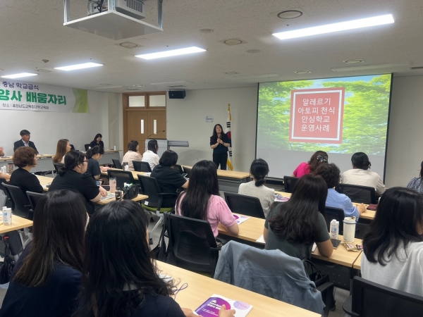 충남교육청은 영양사의 전문성 신장과 소통 역량 고취를 위해 영양사 30명을 대상으로 23일 충남교육청과학교육원에서 2024학년도 영양사 배움자리를 가졌다. 이번 배움자리는 학교급식 담당자로서의 자긍심과 책무성을 높이고 학교급식 정책에 대한 이해를 돕기 위해 마련된 자리로 △기후위기 대응을 위한 탄소중립과 채식 급식 △알레르기와 아토피·천식 안심학교 운영 사례 △학생들과 나를 위한 상담의 실제 등에 대한 교육이 진행됐다. 특히 알레르기와 아토피·천식 안심학교 운영 사례 강의에서는 식품 알레르기의 이해, 유병학생 관리 및 운영법, 나이스를 통한 학생 관리법, 개별 맞춤식단 작성 연습 등 현장에서 실질적으로 활용할 수 있는 내용을 공유해 참가자들의 큰 호응을 얻었다. 황석연 체육건강과장은 “최근 사회적으로 학교급식에 대한 관심이 높아지면서 교육 현장에서도 급식의 중요성이 더욱 강조되고 있다”며 “방학 중에도 열정적으로 참여해주신 영양사 분들께 감사드리며 하반기에도 식중독 예방과 질 높은 학교급식을 위해 최선을 다해달라”고 당부했다. -