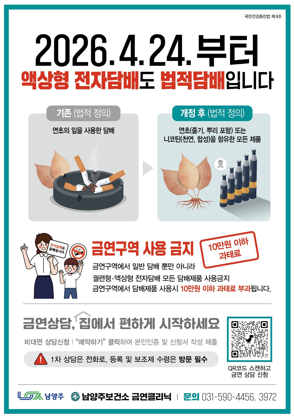 남양주시가 오는 24일부터 합성니코틴 액상형 전자담배에 대한 금연구역 단속을 본격화한다. 그동안 법적 규제의 사각지대에 놓여 있던 액상형 전자담배도 이제 일반 담배와 동일하게 취급되어, 금연구역에서 흡...