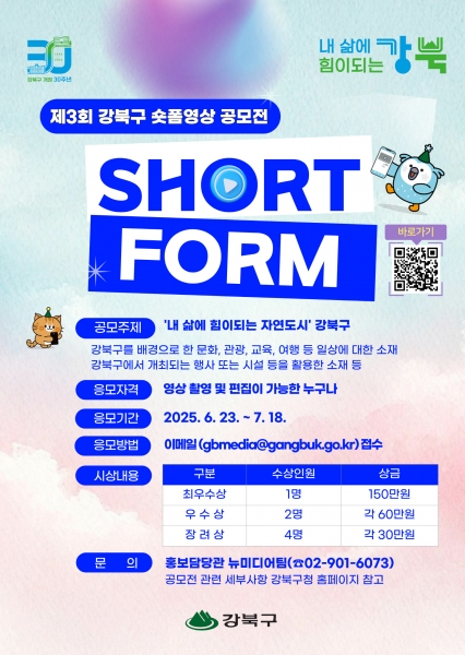 서울 강북구는 자연과 도시가 어우러진 강북구의 매력을 영상으로 담아내는 ‘제3회 강북구 숏폼영상 공모전’을 개최한다고 밝혔다. 이번 공모전은 ‘내 삶에 힘이 되는 자연도시 강북구’라는 주제로 강북구를 배...