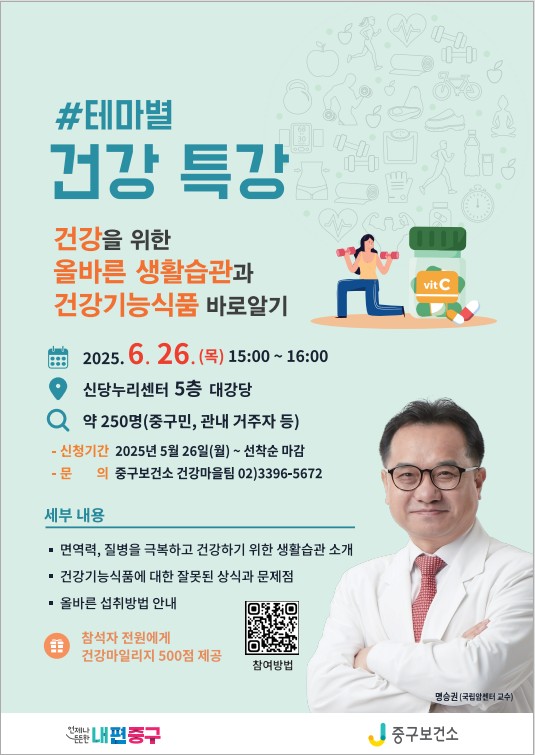 서울 중구가 26일 오후 신당누리센터 5층 대강당에서 구민 건강 증진을 위한 건강특강을 개최한다. 초청 강사인 명승권 현 국립암센터 교수는 ‘건강을 위한 올바른 생활습관과 건강기능식품 바로 알기’라는 주제...