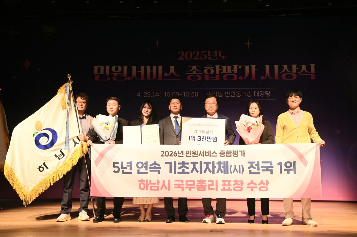 하남시가 전국 기초자치단체 중 가장 뛰어난 민원서비스 역량을 인정받으며 5년 연속 최우수 기관으로 선정됐다. 시는 지난 29일 정부세종청사에서 열린 ‘2025년 민원서비스 종합평가’ 우수기관 시상식에서 국무...