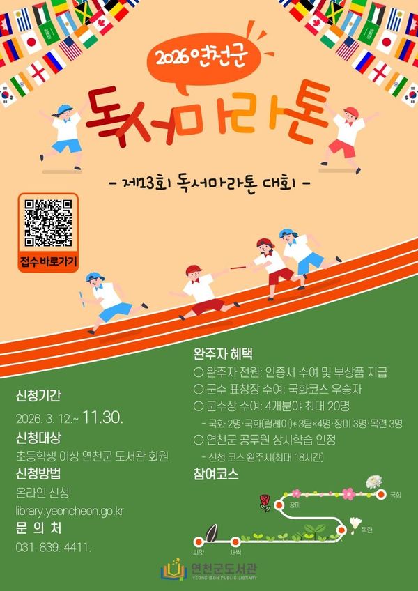 연천군 도서관이 '제13회 독서마라톤대회'를 12일부터 시작해 11월 30일까지 운영한다.이번 행사는 군민들이 책을 통해 서로 소통하고 공감하며, 지역 사회에 독서 문화를 확산하는 데 목적을 두고 있다. 초등학생 이상 연천군 도서관 회원이면 누구나 참여할 수 있다. 신청은 연천군 도서관 홈페이지에서 가능하다.독서마라톤은 참가자가 선택한 코스에 따라 책을 읽고, 읽은 페이지 수를 거리로 환산하여 완주하는 방식으로 진행된다. 책 1페이지를 1m로 계산한다.참가자들은 자신의 독서량에 맞춰 씨앗, 새싹, 목련, 장미, 국화 등 총 5개의 코스 중 하나를 선택할 수 있다. 특히 독서량이 적은 저학년 어린이를 위해 마련된 새싹 코스는 페이지 수 제한 없이 50권의 책을 읽고 독서 감상문을 작성하면 완주로 인정한다.가족이나 기관은 국화 코스에 단체로 참여하여 부담 없이 독서 활동을 즐길 수 있다. 연천군은 독서마라톤 완주자 전원에게 완주 인증서와 함께 부상을 제공할 예정이다. 각 부문별 우승자에게는 연천군수상이 수여된다.군 관계자는 “독서 완주를 장려하기 위해 다채로운 체험 프로그램과 문화 혜택을 준비했다”고 밝혔다. 이를 통해 참가자 만족도를 높이고, 연천군 독서 문화 활성화에 크게 기여할 것으로 기대된다. -