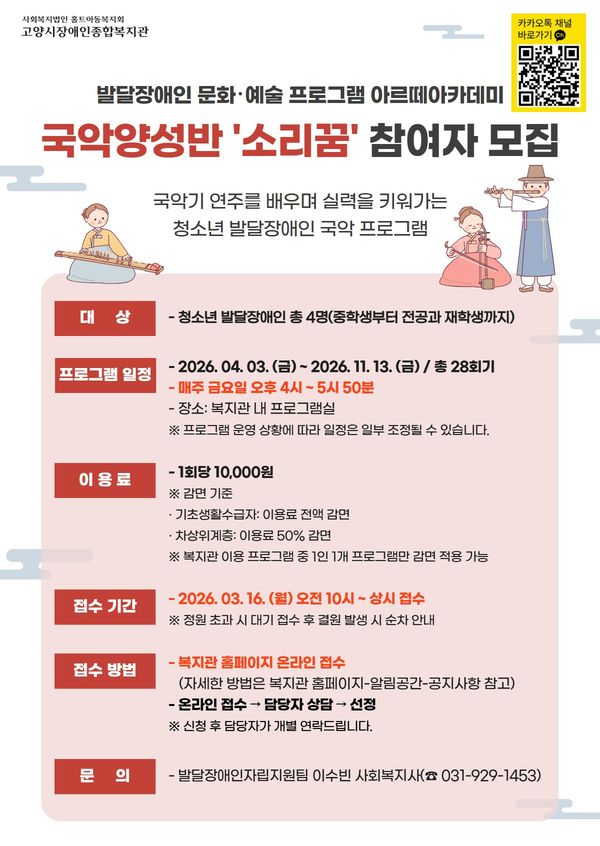 고양시장애인종합복지관이 청소년 발달장애인을 대상으로 국악 양성반 '소리꿈' 참여자를 모집한다. 국악에 대한 잠재력을 가진 청소년들에게 우리 전통 음악을 경험하고, 연주 역량을 키울 수 있는 기회를 제공하기 위해서다.'소리꿈'은 국악을 배우고자 하는 학령기 발달장애인의 꾸준한 수요를 반영하여 새롭게 마련된 프로그램이다. 특히, 단순한 취미 활동을 넘어, 음악적 재능을 가진 아이들이 전문 연주자로 성장할 수 있도록 돕는다는 점에서 의미가 있다.모집 대상은 중학생부터 전공과 재학생까지의 청소년 발달장애인 총 4명이다. 프로그램은 4월 3일부터 11월 13일까지 총 28회기에 걸쳐 진행될 예정이다.수업은 매주 금요일 오후 4시부터 5시 50분까지 복지관 내 프로그램실에서 운영된다. 이용료는 1회당 1만원이다. 복지관 관계자는 "국악에 관심 있는 발달장애 청소년들의 많은 참여를 바란다"고 전했다.접수는 오는 16일 오전 10시부터 고양시장애인종합복지관 누리집을 통한 온라인 접수로 진행된다. 접수 후 담당자 상담을 거쳐 최종 참여자가 선정될 예정이다. 프로그램에 대한 자세한 내용은 복지관 누리집 ‘알림공간-공지사항’ 게시물에서 확인할 수 있으며, 기타 문의는 발달장애인자립지원팀으로 하면 된다.복지관 측은 '소리꿈'을 통해 발달장애 청소년들이 음악적 재능을 발견하고, 사회 구성원으로서 당당하게 성장할 수 있도록 적극 지원할 계획이라고 밝혔다. -