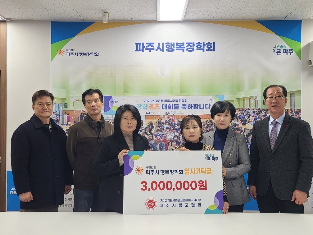 파주시는 파주시행복장학회가 지난 11일 파주시광고협회으로부터 장학금 300만원을 기탁 받았다고 밝혔다.이날 기탁식에는 파주시 관계자를 비롯해 김영숙 행복장학회 이사장, 박경숙 파주시광고협회 회장, 김정호 부회장, 임경환 조직위원장 등 관계자들이 참석해 지역 인재 양성을 위한 뜻깊은 나눔의 시간을 가졌다.파주시광고협회는 지역사회의 일원으로서 미래 인재 육성에 보탬이 되고자 이번 기탁을 마련했으며 전달된 기탁금 300만원은 파주시 관내 학생들을 위한 장학사업에 사용될 예정이다.박경숙 파주시광고협회장은 “파주시의 미래를 이끌어 갈 학생들에게 작은 힘이나마 보태고자 뜻을 모았다”며 “앞으로도 지역과 함께 성장하는 단체로서 사회적 책임을 다하겠다”고 밝혔다.김영숙 행복장학회 이사장은 “학생들을 위해 따뜻한 나눔을 실천해 주신 파주시광고협회에 깊이 감사드린다”며 “기탁해 주신 소중한 장학기금은 도움이 필요한 학생들에게 의미 있게 사용하겠다”고 전했다.한편 행복장학회는 2013년 파주시가 출연해 설립한 장학기관으로 시와 긴밀한 협력체계를 바탕으로 지역 학생들을 위한 다양한 장학사업을 꾸준히 추진해 오고 있으며 설립 이후 현재까지 총 1567명의 학생에게 약 20억 9천만원의 장학금을 전달하는 등 지역인재 육성과 교육복지 실현에 앞장서는 든든한 버팀목 역할을 하고 있다. -