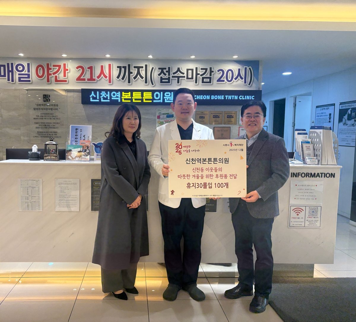 신천역본튼튼의원은 지난 12월 9일 신천동 행정복지센터에 휴지 30롤, 100개를 전달하며 이웃 사랑을 실천했다.전달식에는 본튼튼의원 원종찬 대표원장과 신화철 신천동장이 참석했으며, 후원 물품은 시흥시1%복...