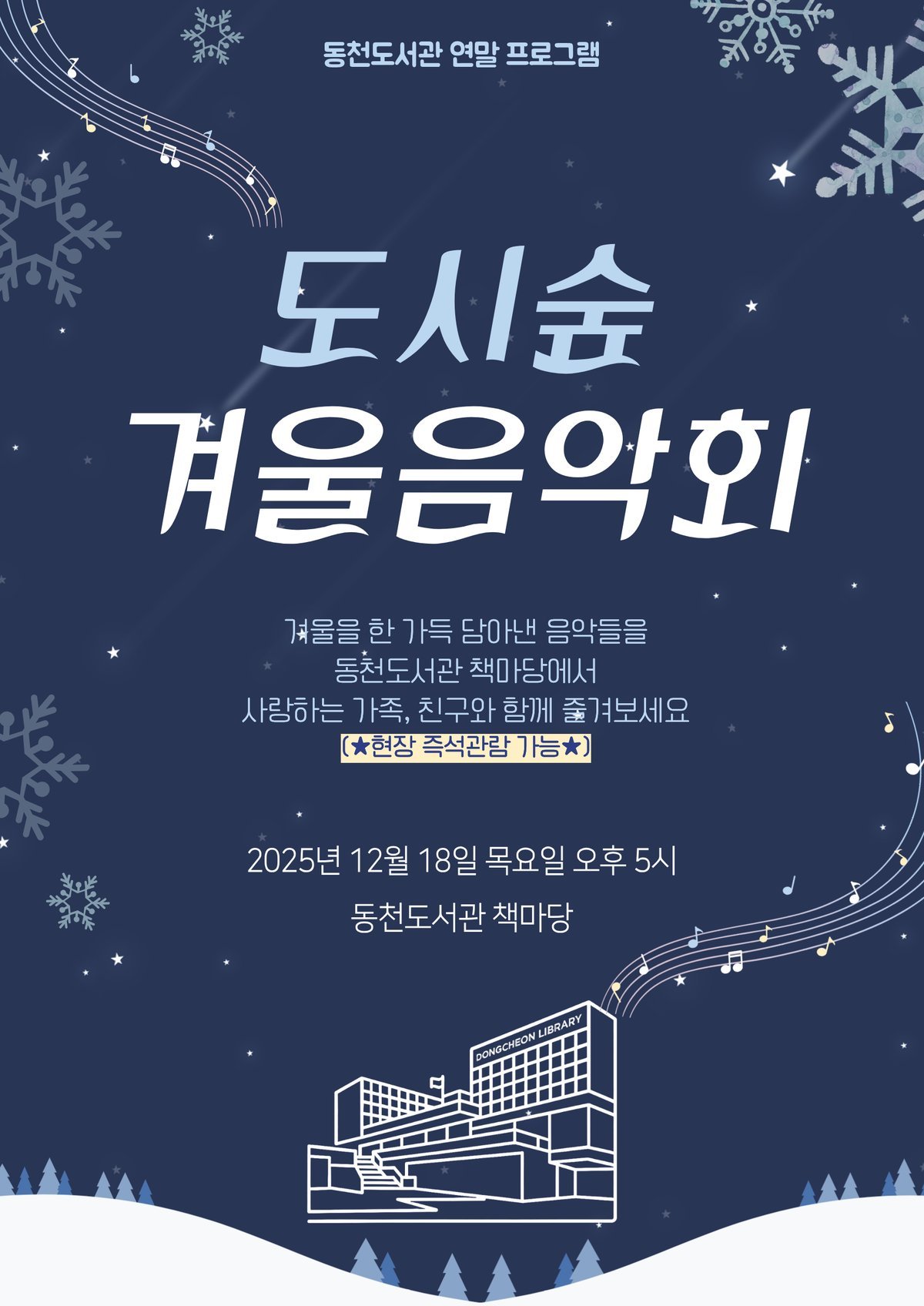 용인특례시 동천도서관이 오는 18일, 특별한 음악회를 개최한다.'도시숲 겨울 음악회'는 이날 오후 5시부터 6시까지 동천도서관 지하 1층 책마당에서 열린다.이번 음악회는 추운 겨울, 도서관을 찾은 ...