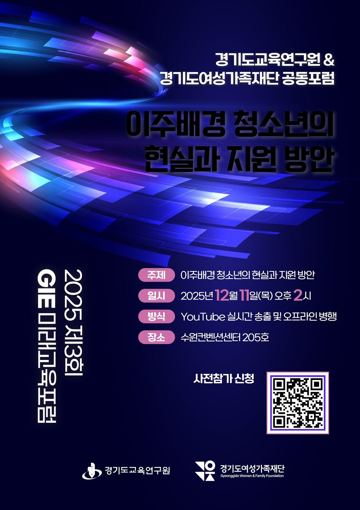 경기도여성가족재단이 11일 오후 2시 수원컨벤션센터에서 ‘이주배경 청소년의 현실과 지원방안’을 주제로 경기도교육연구원과 공동포럼을 개최한다.8번째를 맞은 포럼은 재단과 도 교육연구원 간 연구교류를 위한...