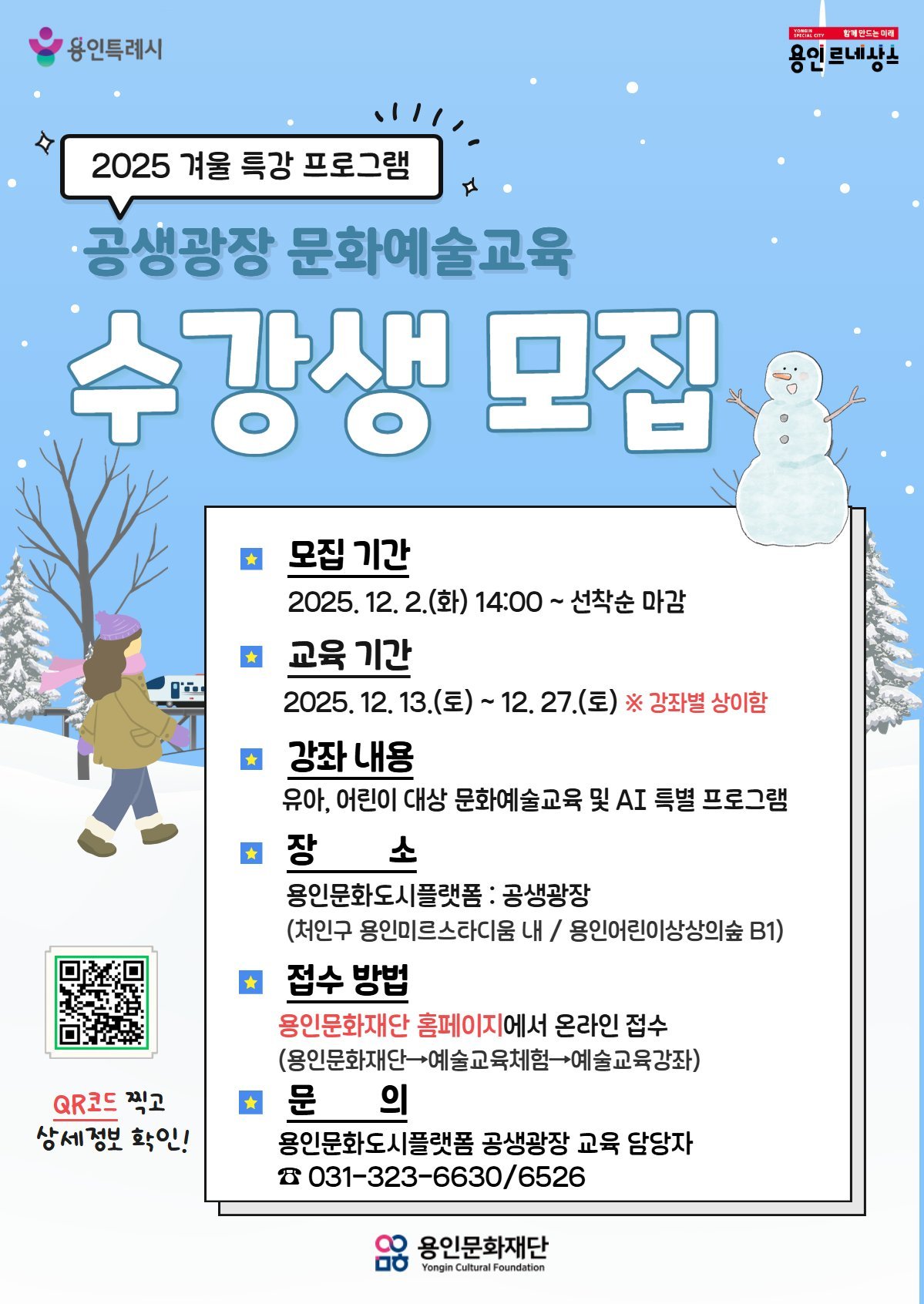 용인문화재단이 겨울방학을 맞아 유아와 어린이를 대상으로 하는 특별한 문화예술 교육 프로그램을 운영한다.이번 특강은 아이들의 창의력과 예술적 감수성을 키울 수 있도록 AI, 미술, 연극 등 다양한 분야의 12...