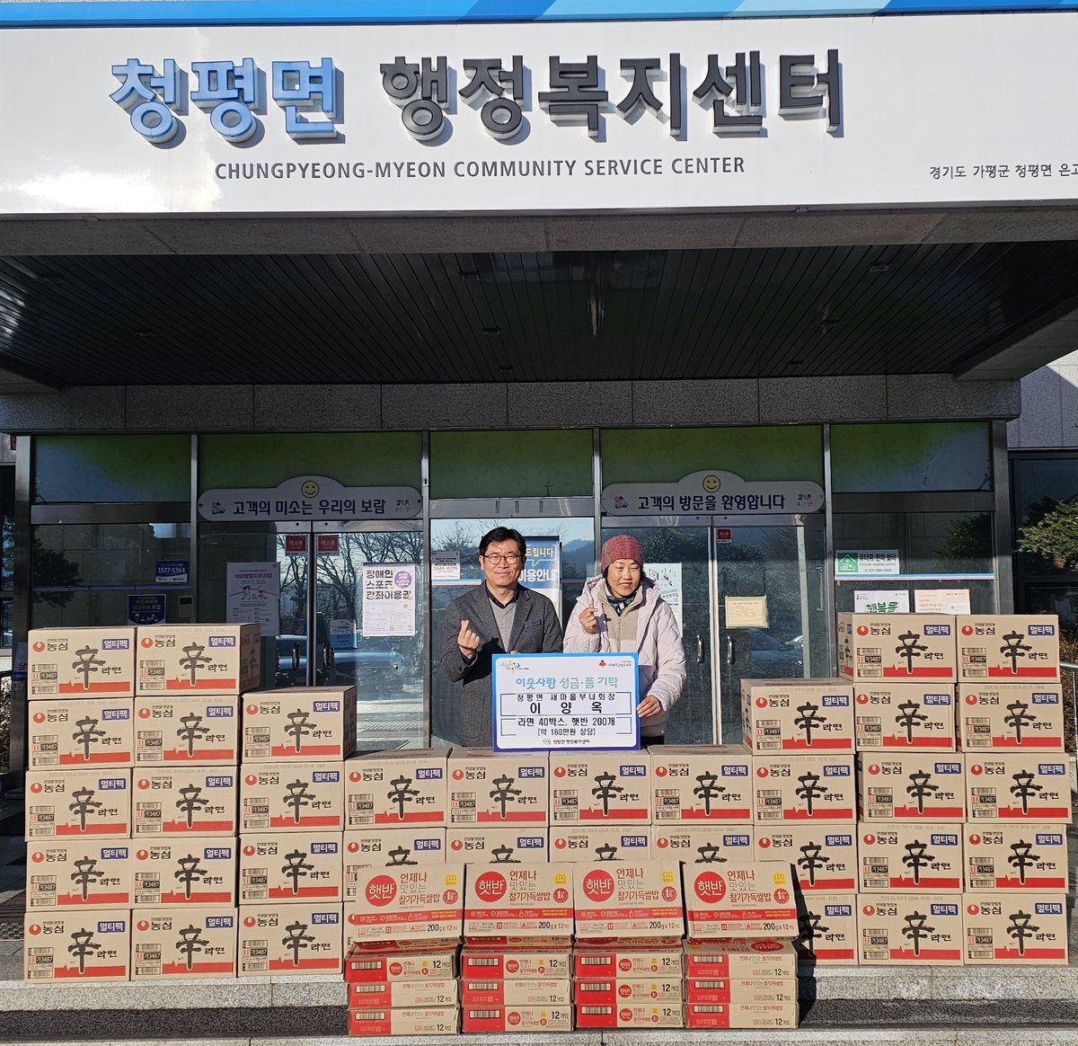가평군 청평면의 이양옥 새마을부녀회장이 최근 어려운 이웃들이 따뜻한 겨울을 보낼 수 있도록 160만원 상당의 라면과 즉석밥을 기탁하며 훈훈한 소식을 전했다.이 회장은 라면 40박스와 즉석밥 200개를 청평면...