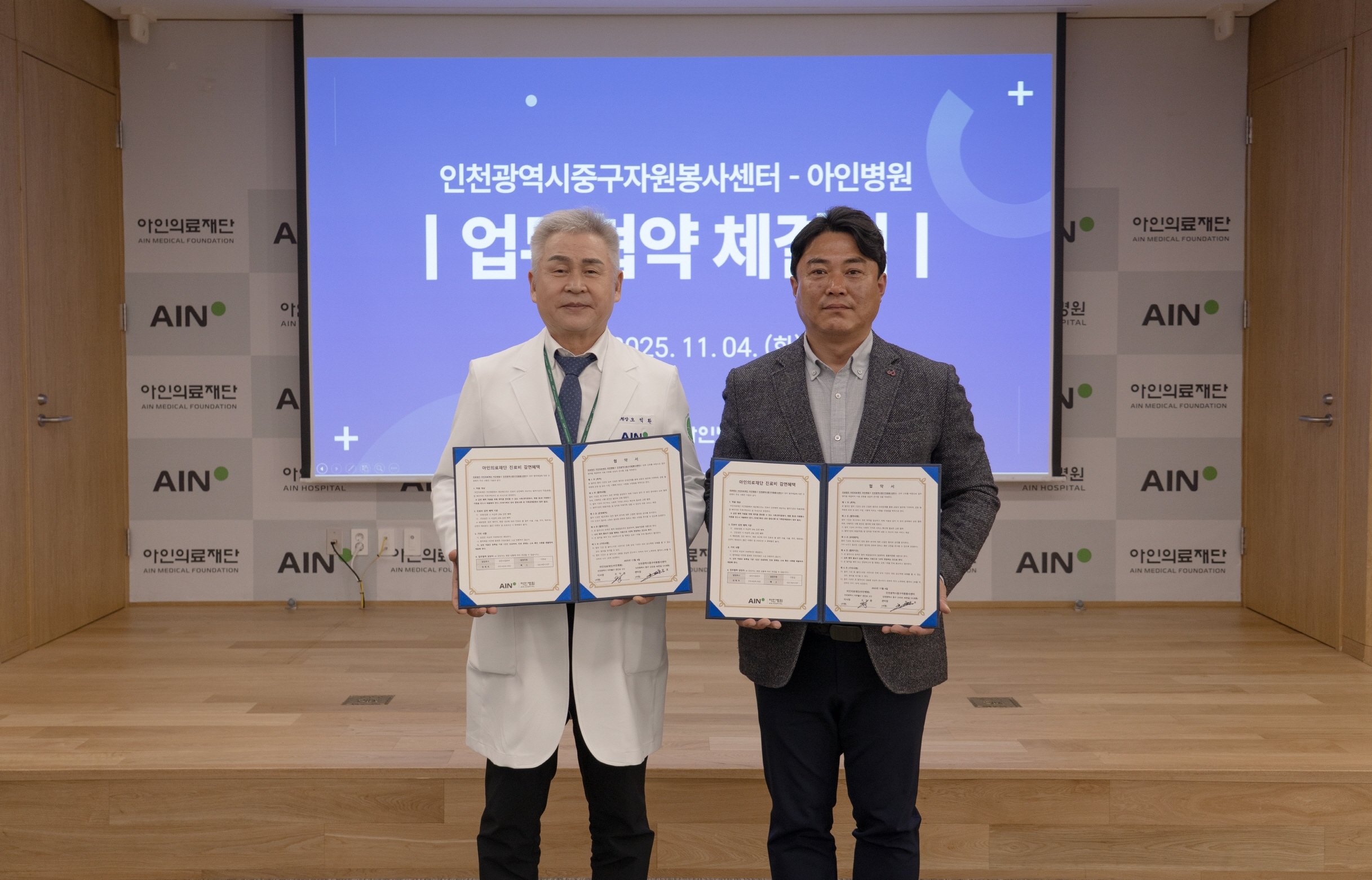 인천중구자원봉사센터, 아인병원과 업무 협약 체결…자원봉사자 건강 증진 기대