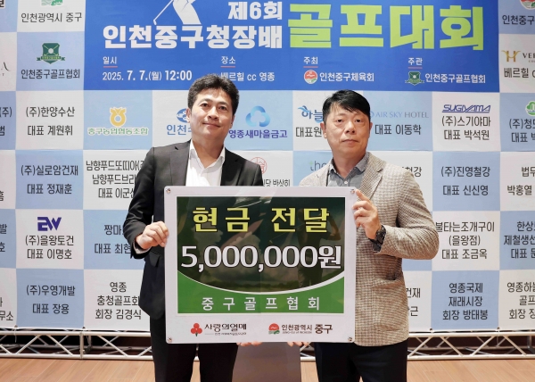 인천시 중구는 최근 중구골프협회로부터 이웃돕기 성금 500만원을 기탁받았다고 10일 밝혔다. 기탁식은 지난 7일 베르힐 CC 영종에서 열린 ‘제6회 중구청장배 골프대회’에서 진행됐다. 이를 통해 대회 참가자...