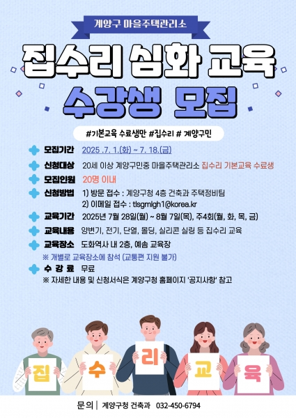 인천광역시 계양구는 주거취약계층을 위한 집수리 서비스 자원봉사자 양성과 주민들의 자활 수리능력 배양을 위해 ‘2025년도 마을주택관리소 집수리 심화교육’ 수강생을 모집한다. 마을주택관리소는 그간 기본 ...