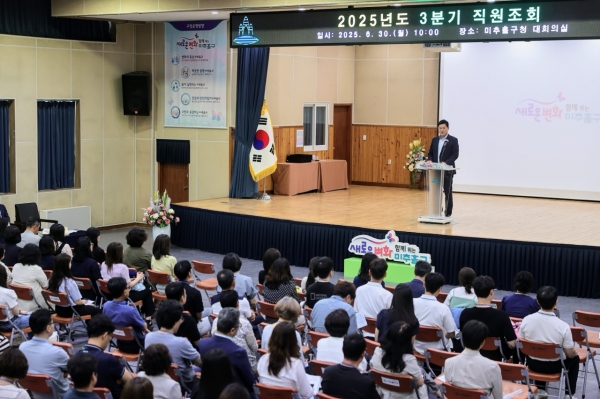 인천 미추홀구는 30일 구청 대회의실에서 2025년도 3분기 직원 조회를 개최했다. 이날 직원 조회에서는 민선 8기 이영훈 구청장 취임 3주년을 맞아 인천시립장애인예술단의 기념 공연과 함께, 지난 3년간의 발자...
