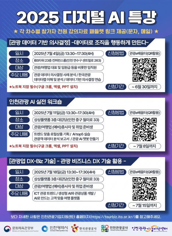 인천광역시와 인천관광공사는 한국관광공사와 함께 지역 관광업계의 디지털 전환과 인공지능 활용 역량 강화를 위한 ‘디지털 AI 특강’을 오는 7월 4일부터 18일까지 매주 금요일 총 3회에 걸쳐 진행한다고 밝혔다...