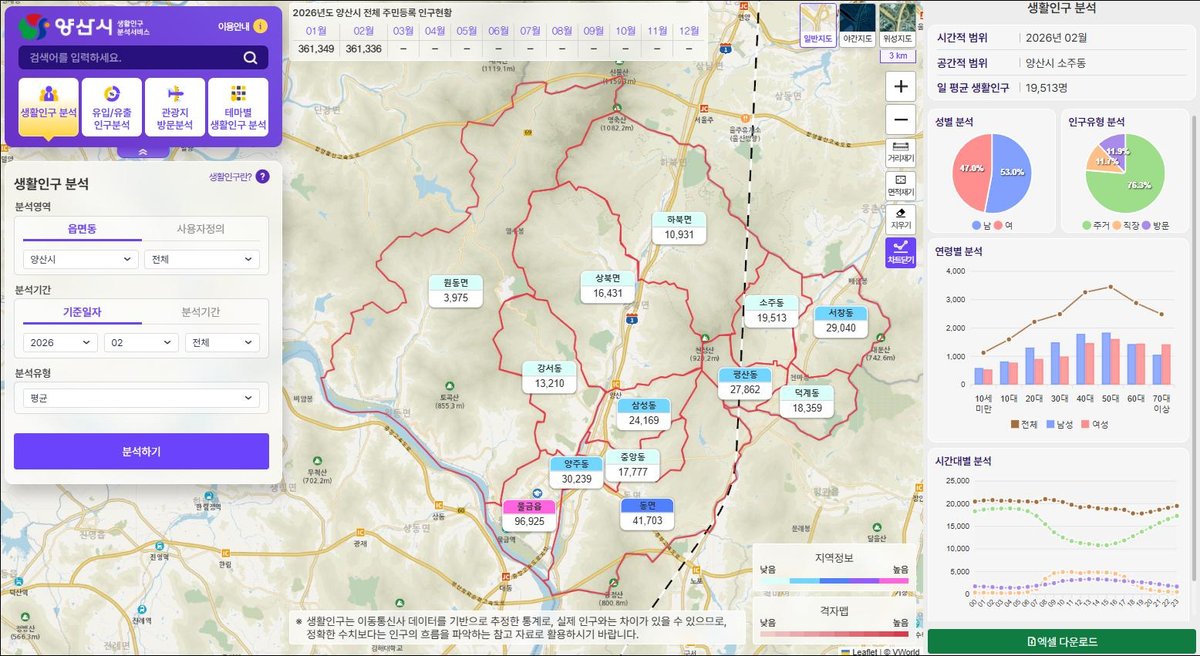 양산시가 빅데이터를 활용해 도시의 실제 움직임을 파악하는 '양산시 생활인구 분석 서비스'를 구축하고 시민들에게 공개했다. 이는 기존의 정적인 인구 통계를 넘어, 지역 내 활동하는 인구의 흐름을 ...