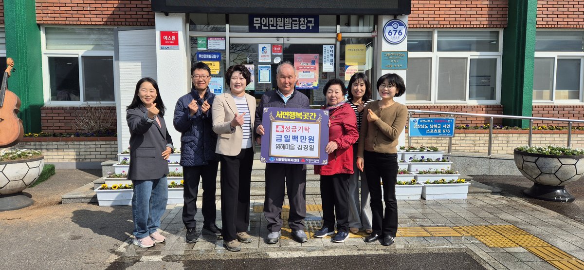 서면 염해마을에 거주하는 김경일, 차옥자 부부가 지난 26일 서면행복곳간을 통해 이웃돕기 성금 100만원을 기탁하며 지역 사회에 따뜻한 온정을 전했다.어려운 이웃을 돕고자 하는 부부의 따뜻한 마음이 훈훈함을 더하고 있다.김경일 씨는 “주변에 아직도 어려운 이웃들이 있어 마음이 쓰였다”며 “작은 정성이지만 꼭 필요한 분들께 조금이나마 힘이 되었으면 하는 바람으로 기탁하게 됐다”고 소감을 밝혔다.평소 바르게살기운동 회원으로 활동하며 지역사회를 위한 봉사활동에 적극 참여하는 김경일 씨의 꾸준한 선행이 주변에 귀감이 되고 있다.부부는 이웃 사랑을 몸소 실천하며 지역사회 발전에 기여하고 있다.박민희 서면장은 “이웃을 생각하는 따뜻한 마음으로 소중한 나눔을 실천해주신 김경일 차옥자 부부께 깊이 감사드린다”고 말했다. 이어 “전해주신 정성은 어려운 이웃들에게 큰 위로와 힘이 될 수 있도록 소중히 전달하겠다”고 덧붙였다.서면은 김경일, 차옥자 부부의 따뜻한 마음이 담긴 성금을 어려운 이웃들에게 전달할 예정이다. 이를 통해 지역 사회 복지 증진에 더욱 힘쓸 계획이다. -