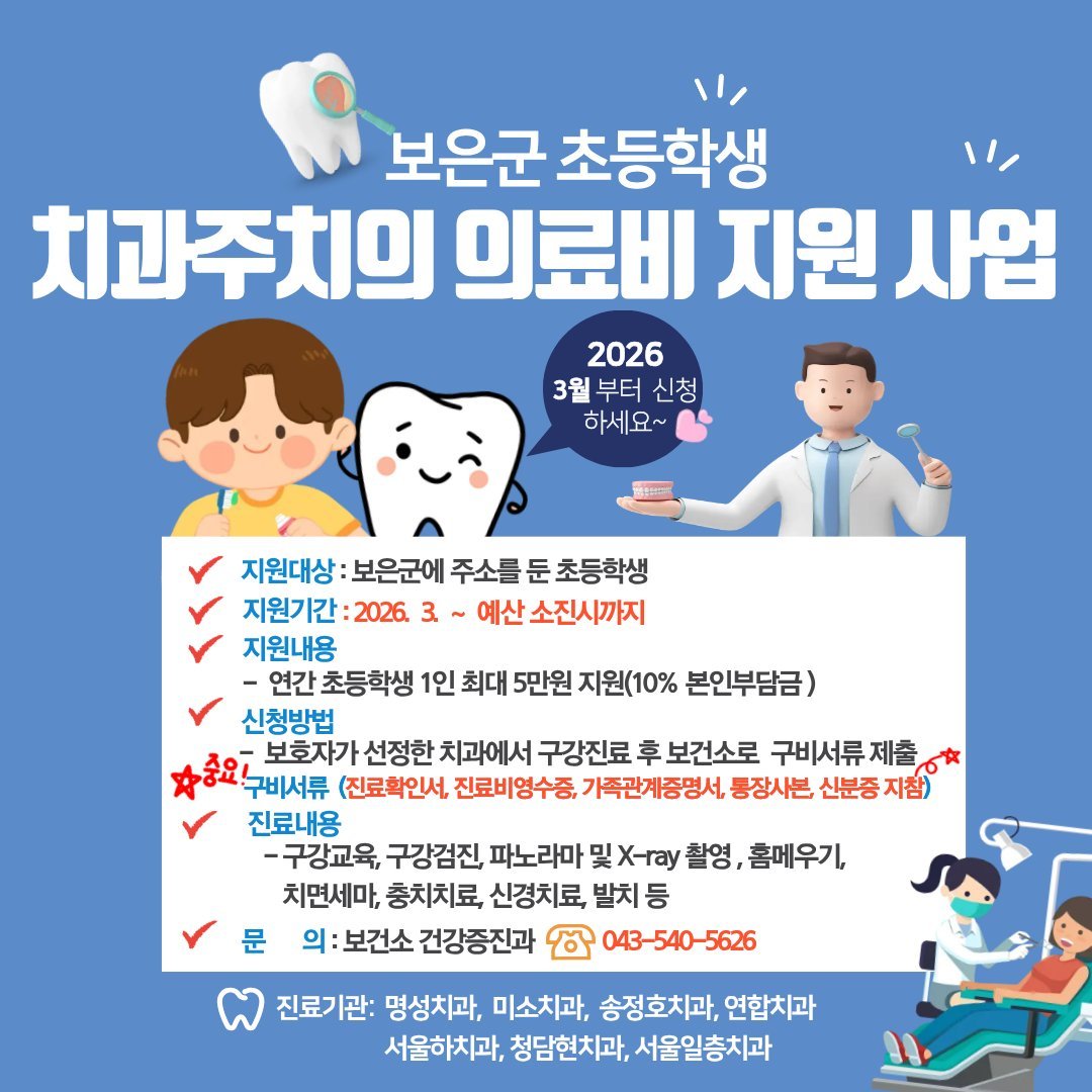 보은군, 초등학생 치과 진료비 지원 사업 시행