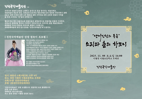 생거진천문화재단은 오는 11월 8일 오후 4시 이월초등학교 ‘무제관’에서 진천국악예술단이 ‘진천의 풍류, 소리와 춤의 하모니’ 공연을 개최한다고 20일 밝혔다. 이번 공연은 재단 후원으로 지역 어르신들께 감...
