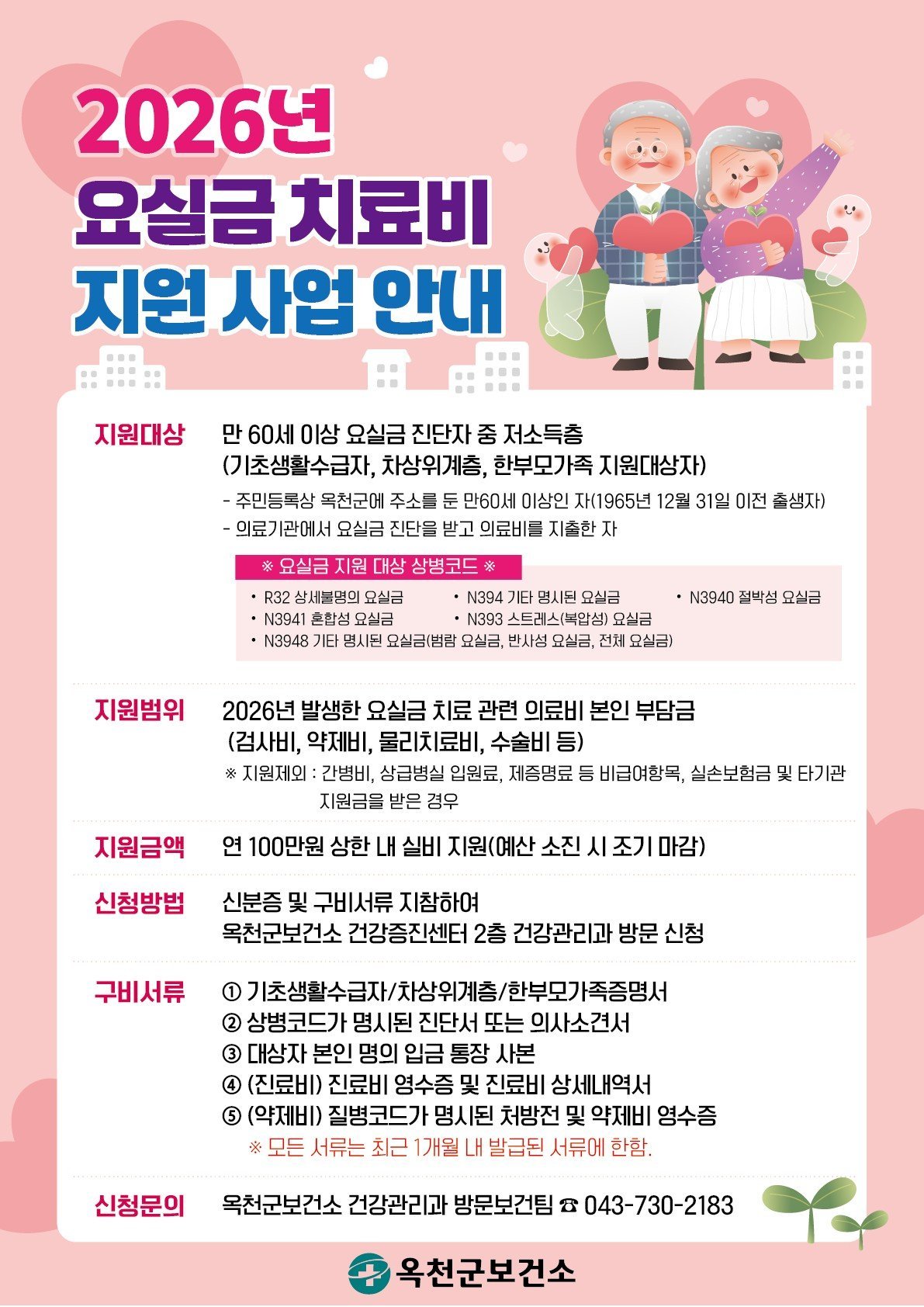 옥천군보건소가 요실금으로 고통받는 만 60세 이상 저소득층 어르신들을 위해 치료비 지원 사업을 시작한다.경제적인 이유로 치료를 미루던 어르신들에게 실질적인 도움을 주기 위한 이번 사업은, 요실금 진단을 받은 옥천군민을 대상으로 의료비 부담을 줄여 조기 치료를 유도하는 데 목적이 있다.지원 대상은 옥천군에 거주하는 만 60세 이상 기초생활수급자, 차상위계층, 한부모가족 중 요실금 진단을 받고 의료비를 지출한 군민이다. 2026년에 발생한 요실금 치료 관련 의료비 본인부담금이 지원 대상에 포함된다.다만, 간병비나 상급병실 입원료, 제증명료 등 비급여 항목과 실손보험금, 타 기관 지원금 수령액은 지원 대상에서 제외된다. 지원 금액은 연간 최대 100만원 한도 내에서 실비로 지급될 예정이다.신청을 원하는 대상자는 신분증과 함께 관련 증명서, 진단서 또는 의사소견서, 본인 명의 통장 사본, 진료비 영수증 및 상세내역서, 처방전 및 약제비 영수증 등 구비서류를 지참하여 옥천군보건소 건강증진센터 1층 재활센터에 방문 접수하면 된다. 모든 서류는 최근 1개월 이내 발급분이어야 한다.옥천군보건소 관계자는 “요실금은 적극적인 치료를 통해 충분히 개선 가능한 질환”이라며, “이번 지원 사업이 의료비 부담으로 치료를 망설였던 어르신들에게 실질적인 도움이 되기를 바란다”고 밝혔다. 이번 사업을 통해 옥천군 어르신들의 건강 증진과 삶의 질 향상에 기여할 것으로 기대된다. -