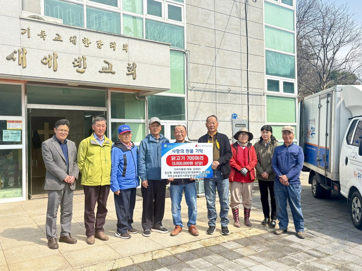 정산면 새에덴감리교회가 가마치통닭, 작은교회살리기연합회와 손을 잡고 지역 내 취약계층 어르신들을 위해 닭고기 700마리를 기탁했다.26일, 새에덴감리교회에서 열린 기탁식에는 가마치통닭 김재곤 대표와 작은교회살리기연합회 이창호 회장을 대신해 새에덴감리교회 윤재천 원로목사가 참석했다. 윤 원로목사는 나눔의 뜻을 전하며 훈훈한 분위기를 연출했다.기탁된 닭고기 700마리는 청양군지역활성화재단을 통해 관내 공공급식 경로당 94개소에 순차적으로 전달될 예정이다. 닭고기는 어르신들의 영양 보충과 건강한 식생활에 큰 도움을 줄 것으로 보인다.윤재천 원로목사는 “지역사회와 함께하는 나눔 실천이 중요하다”며 “앞으로도 어려운 이웃을 위한 다양한 지원을 이어갈 것”이라고 밝혔다. 그의 말에서 지역사회에 대한 깊은 애정을 엿볼 수 있다.김돈곤 군수는 “지역사회를 위한 따뜻한 나눔에 동참해주신 기탁자분들께 깊이 감사드린다”고 말했다. 이어 “기탁해주신 물품은 꼭 필요한 곳에 소중히 전달하겠다”고 약속했다.군은 앞으로도 민·관 협력을 통해 나눔 문화 확산에 힘쓸 계획이다. '행복을 더하는 기부, 기부로 바꾸는 청양'을 실현하기 위해 더욱 노력할 것으로 전망된다.