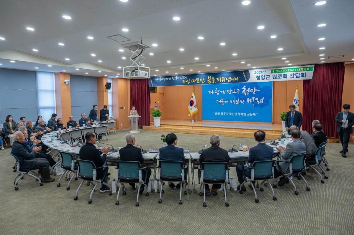 청양군이 지역 사회 발전에 헌신한 원로들의 의견을 듣는 '2026년 원로회 간담회'를 개최했다. 군은 이들의 고견을 군정에 반영하여 '행복한 청양'을 만들어갈 계획이다.지난 25일, 군청 대회의실에서 열린 간담회에는 김돈곤 군수를 비롯해 10개 읍면 원로회 회장 및 총무, 관계 공무원 등 30여 명이 참석했다. 이들은 지역의 미래를 위한 심도 있는 대화를 나눴다.김돈곤 군수의 인사말로 시작된 행사는 군 홍보영상 시청, 행정지원과장의 주요 군정 현안 설명, 참석자 간 자유로운 의견 교류 순으로 진행됐다. 원로들은 오랜 경험을 바탕으로 지역 발전을 위한 다양한 제언과 주민들의 애로사항을 전달하며 군정 발전에 힘을 보탰다.김 군수는 “평생을 지역 발전에 이바지해 오신 원로들을 모시게 되어 뜻깊다”고 말했다. 그는 이어 “오늘 주신 소중한 조언과 지혜는 향후 군 정책 수립과 운영에 적극적으로 반영하여 ‘행복한 청양’을 만드는 이정표로 삼겠다”고 밝혔다.청양군 원로회는 관련 규정에 따라 지역 내 덕망 있는 인사 40명 이내로 구성되어 운영 중이다. 군정 주요 시책에 대한 의견 제시뿐만 아니라 주민 건의 사항을 행정에 전달하는 소통 창구 역할을 한다.