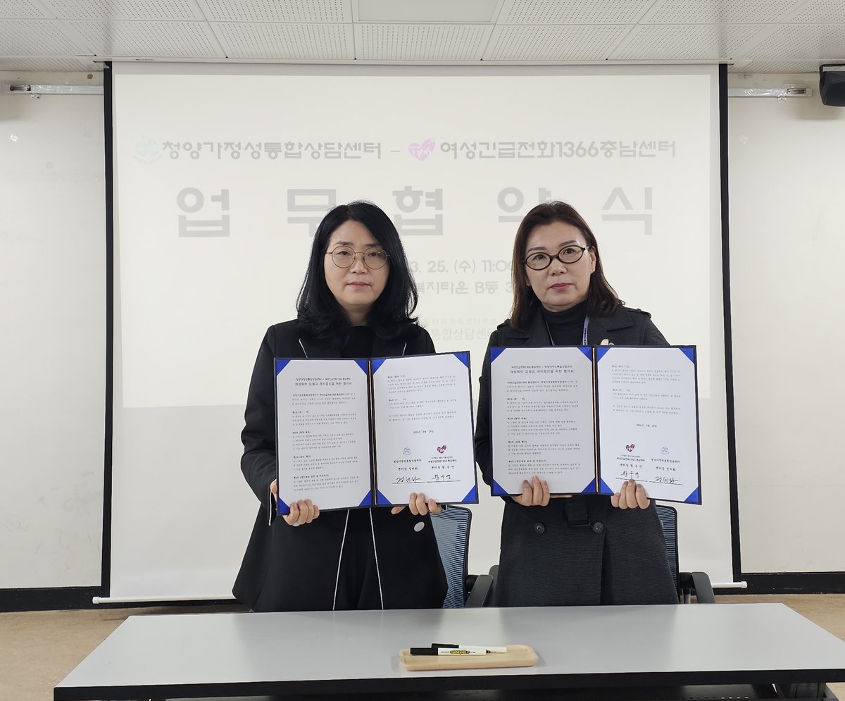 청양군이 여성 폭력으로부터 안전한 지역 사회를 만들기 위해 여성긴급전화 1366 충남센터와 손을 잡았다.청양가정성통합상담센터는 지난 25일 여성긴급전화 1366 충남센터와 업무협약을 체결하고, 지역 내 여성 폭력 피해자 지원을 위한 협력 체계를 구축한다고 밝혔다. 이번 협약은 가정폭력, 성폭력, 스토킹 등으로 고통받는 여성들을 위한 신속하고 체계적인 보호망을 만들기 위해 추진됐다.여성긴급전화 1366 충남센터는 365일 24시간 운영되는 긴급 상담 기관이다. 전화 상담은 물론 사이버 상담, 현장 구조, 긴급 피난처 제공 등 다양한 서비스를 제공한다.이번 협약을 통해 양 기관은 여성 폭력 피해자 보호 및 지원 사업을 공동으로 추진하고, 피해자 지원을 위한 인적 교류 및 전문 네트워크를 강화할 계획이다. 또한 개인정보 보호 및 비밀 유지 의무를 철저히 준수하며 기관 발전을 위해 상호 협력하기로 했다.정미화 청양가정성통합상담센터장은 "이번 협약으로 지역 내 여성 폭력 피해자에 대한 24시간 대응과 체계적인 지원이 가능해질 것으로 기대한다"고 말했다.이어 "앞으로도 유관기관과의 견고한 협력을 통해 피해자 보호와 치유에 최선을 다하겠다"고 덧붙였다. 청양군은 이번 협약을 통해 여성들이 더욱 안전하고 행복한 삶을 누릴 수 있을 것으로 기대하고 있다.도움이 필요한 여성 폭력 피해자는 청양가정성통합상담센터를 통해 전문적인 상담과 연계 지원을 받을 수 있다. 이번 협약은 체결일로부터 효력이 발생하며 양 기관의 협의에 따라 지속적으로 유지될 예정이다.