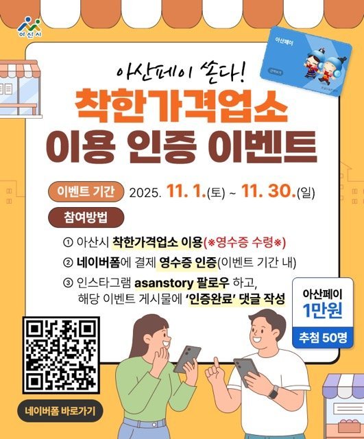 아산시가 고물가 시대에 합리적인 가격으로 서비스를 제공하는 착한가격업소를 확대하고, 시민들의 이용을 장려하기 위한 인증 이벤트를 11월 한 달간 진행한다.이번 조치는 지역 물가 안정과 서민 경제를 지원하...