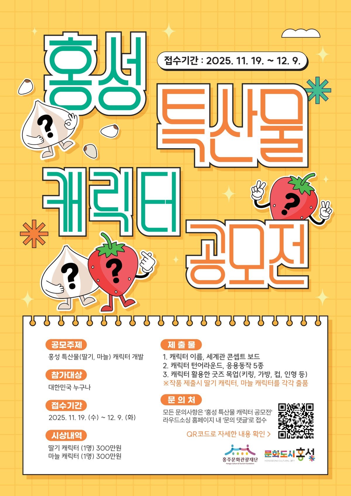 홍성군은 홍성의 대표 특산물인 딸기와 마늘을 활용한 ‘홍성 특산물 캐릭터 공모전’을 실시한다. 본 공모전은 지역 농산물의 인지도 확대와 홍성군의 브랜드 이미지를 강화하기 위해 마련되었다.참가자는 딸기 또...