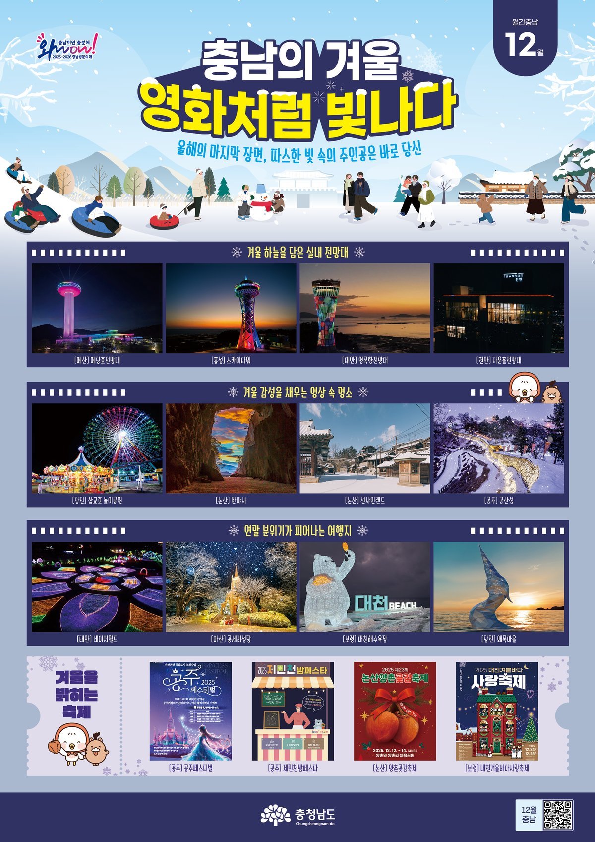 충남도가 '충남의 겨울, 영화처럼 빛나다'라는 주제로 12월의 관광 명소를 소개하며, 낭만적인 겨울 여행을 제안한다.차가운 바람을 피해 따뜻한 실내에서 충남의 아름다운 풍경을 감상할 수 있는 전망...