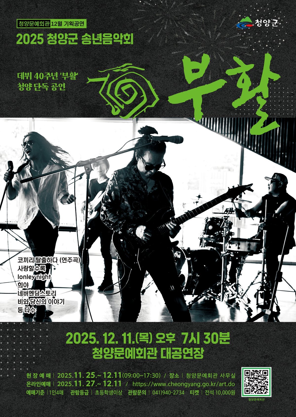 대한민국 록의 역사를 써온 밴드 부활이 데뷔 40주년을 기념하여 청양에서 특별한 공연을 펼친다.12월 11일 저녁 7시 30분, 청양문예회관 대공연장에서 열리는 이번 콘서트는 부활의 40년 음악 여정을 기념하는 ...