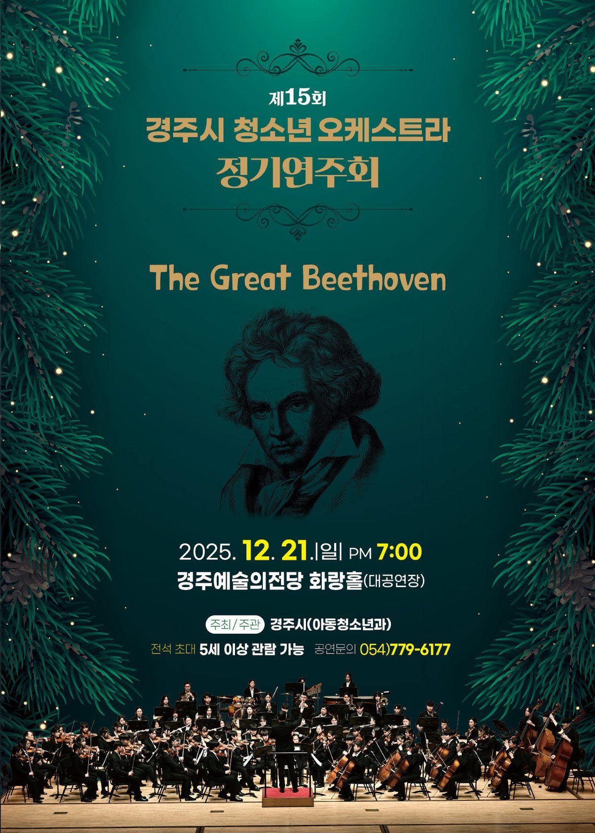 경주시 청소년오케스트라가 오는 12월 21일 경주예술의전당 화랑홀에서 제15회 정기연주회를 개최한다. 'The Great Beethoven'이라는 주제로 열리는 이번 연주회는 청소년들의 음악적 열정과 기량을 선보이는 무대가 될 전망이다.2010년 창단 이후 꾸준히 활동해온 경주시 청소년오케스트라는 다양한 장르를 소화하며 시민들의 사랑을 받아왔다. 이번 연주회에서는 베토벤의 명곡들을 통해 더욱 깊은 감동을 선사할 예정이다.연주회는 1부와 2부로 나뉘어 진행된다. 1부에서는 강렬한 리듬의 'Preparense Tango'를 시작으로, 경주 출신 피아니스트 최호준과의 협연으로 베토벤 피아노 협주곡 1번 C장조가 연주된다. 청소년 단원들과 최호준 피아니스트의 조화로운 앙상블이 기대된다.2부에서는 베토벤 교향곡 7번 전 악장이 연주된다. 웅장하고 역동적인 에너지가 넘치는 베토벤의 대표작을 통해 청소년 단원들의 음악적 성장과 완성도를 확인할 수 있을 것이다.이번 정기연주회는 5세 이상 아동, 청소년, 시민, 관광객 누구나 무료로 관람할 수 있다. 공연 시작 1시간 전부터 현장에서 선착순으로 티켓을 배부한다.주낙영 경주시장은 “이번 연주회가 청소년 단원들의 노력과 열정이 담긴 무대로 시민들에게 깊은 감동을 선사하길 바란다”고 전했다. 연말, 가족과 함께 청소년들의 아름다운 선율을 감상하며 따뜻한 시간을 보내는 것은 어떨까. -