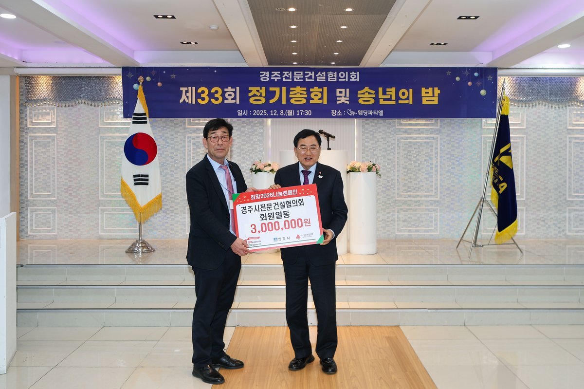 경주시는 8일 경주시 전문건설협의회가 정기총회에서 지역의 어려운 이웃을 돕기 위한 성금 2600만 원을 기탁했다고 밝혔다.경주시 전문건설협의회는 지역 건설업 종사자의 권익 보호를 위해 1995년 설립됐으며, 장학금 지원과 성금 기탁 등 꾸준한 사회공헌 활동을 이어오고 있다.지난해에도 연말 성금 500만 원과 장학금 1500만 원을 기탁하는 등 지역발전에 힘을 보탰다.이번 성금은 협회와 회원사 14곳이 함께 마련했다.참여 기업은 △㈜이원건설 △㈜한결건설 △㈜험프콘 △화진개발㈜ △대승건설㈜ △㈜서기건설 △한서건설㈜ △㈜유원건설 △㈜도경건설 △일등건설㈜ △㈜대본테크 △㈜동주조경 △㈜서광페인트 등이다.권영석 회장은 “회원사들이 마음을 모아 지역사회에 작은 보탬이 되고자 성금을 준비했다”며 “앞으로도 지역경제 활성화와 안전한 건설환경 조성을 위해 책임을 다하고, 지역사회와 상생하는 나눔을 지속하겠다”고 말했다.주낙영 경주시장은 “매년 연말 어려운 이웃을 위해 따뜻한 정성을 모아주시는 전문건설협의회에 깊이 감사드린다”며 “성금은 취약계층 복지 향상을 위해 소중하게 사용하겠다”고 말했다. -