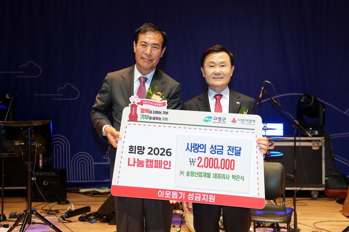 ㈜송정산업개발이 고령군에 사랑의 성금 200만원을 기탁하며 지역사회에 따뜻한 온정을 전했다.이번 기탁은 지난 12월 7일 대가야문화누리 우륵홀에서 열린 고령인터넷뉴스 창간 10주년 기념식 및 독자편집위원장 이·취임식에서 이루어졌다.송정산업개발은 평소에도 꾸준한 이웃사랑을 실천하며 지역사회에 기여해 온 기업이다. 고령군 다산면에 위치한 토공사업체인 송정산업개발은 이번 성금 기탁을 통해 지역 내 저소득 계층을 위한 지원에 나선다.고령인터넷뉴스 독자편집위원장으로 취임한 ㈜송정산업개발 관계자는 “어려운 이웃들에게 희망을 전달하고 싶다”며 기탁 소감을 밝혔다.고령군은 “지역사회를 위한 귀한 나눔에 감사드리며, 도움이 필요한 이웃들에게 소중히 전달하겠다”고 답했다. 이번 성금은 고령군 관내 저소득 계층을 위해 사용될 예정이다.송정산업개발의 꾸준한 사회공헌 활동은 지역사회에 긍정적인 영향을 미치고 있으며, 앞으로도 지속적인 나눔을 통해 따뜻한 사회를 만들어가는 데 기여할 것으로 기대된다.