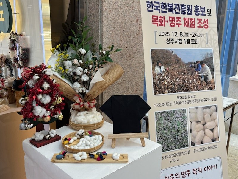 한국한복진흥원 입주기업인 누미한이 12월 8일부터 24일까지 상주시청 로비에서 특별한 전시를 진행한다. 이번 전시는 진흥원 내 목화밭에서 직접 재배한 목화솜과 명주천을 활용하여 시민들에게 색다른 경험을 선사할 예정이다.누미한은 한국한복진흥원 입주기업들로 구성된 ‘한복 및 상주함창명주 발전연구회’의 브랜드다. 한복 산업 발전과 전통 소재의 가치 확산을 위해 꾸준히 활동하고 있다.이번 전시는 특히 한국한복진흥원의 목화밭에서 수확한 국내산 목화솜을 주재료로 활용했다. 누미한은 이 목화솜으로 꽃다발, 크리스마스 리스 등 다양한 작품을 제작하여 전시한다.또한, 명주천으로 만든 족두리 등도 함께 선보이며 관람객들의 눈길을 사로잡고 있다. 시민과 공무원들이 평소 접하기 어려운 한복 제작 재료를 직접 만져보고 느껴볼 수 있도록 기획된 점이 특징이다.전시장을 찾은 관람객들은 목화솜과 명주천의 질감을 직접 느끼며 전통 소재의 아름다움을 체험할 수 있다. 특히, 패키지 형태로 포장된 목화솜을 가져갈 수 있는 체험 공간도 마련되어 전시의 재미를 더한다.조성광 문화예술과장은 이번 전시가 시민들에게 한복 제작 재료의 매력을 알리고, 한복을 일상 속에서 자연스럽게 접하는 기회가 되기를 바란다고 밝혔다. -